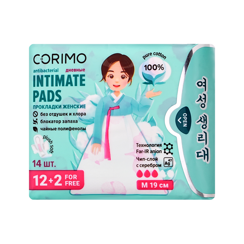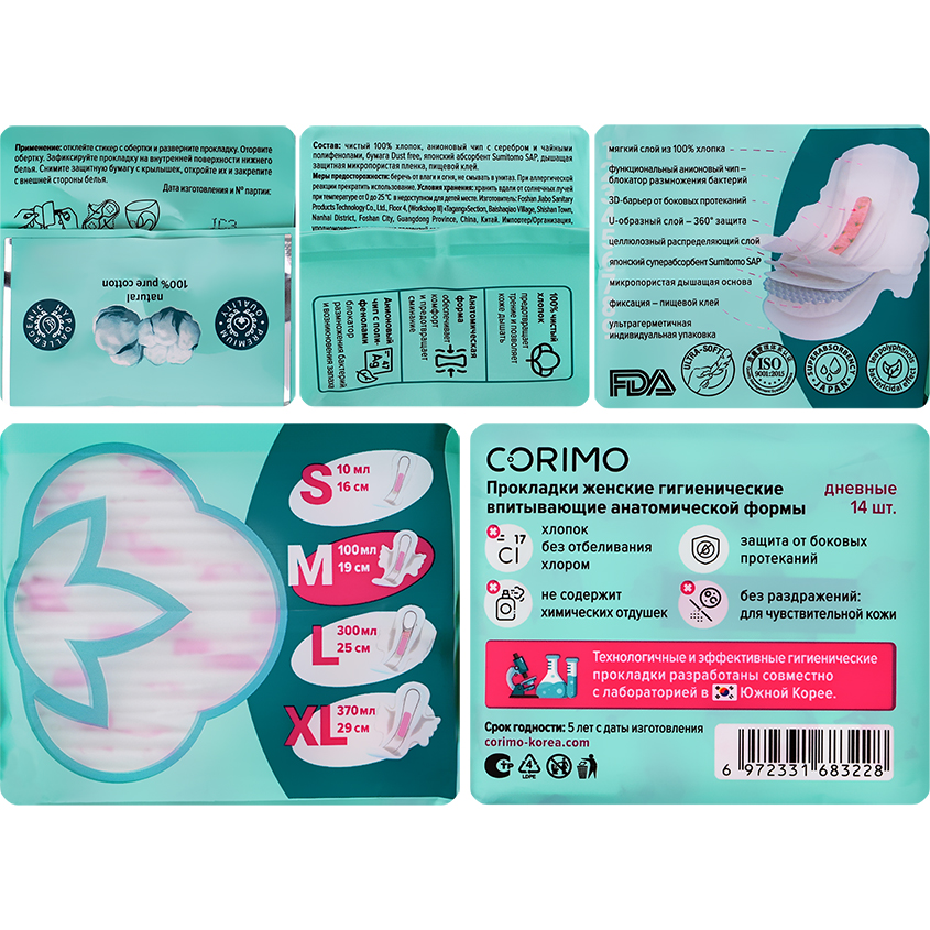 Технологичные и эффективные прокладки нового поколения разработаны совместно с лабораторией в Южной Корее. 100% натуральный чистый хлопок предотвращает трение и позволяет коже дышать. Безопасные материалы прокладки не вызывают раздражения и дискомфорта, а анатомическая форма предотвращает сминание. Прокладки Corimo содержат функциональный анионовый чип с наносеребром и чайными полифенолами, который блокирует размножение бактерий и возникновение запаха. Специальные бортики с обоих сторон надежно защищает от боковых протеканий. Главным преимуществом прокладок Corimo является японский суперабсорбент Sumitomo SAP, который превращает влагу в гель и способен впитать в 30 раз больше своего веса. Для свободной циркуляции воздуха и профилактики размножения патогенной микрофлоры непромокаемая дышащая основа выполнена из микропористого материала. Прокладка крепится к белью с использованием нетоксичного пищевого клея. Каждая прокладка Corimo защищена от пыли и влаги герметичной индивидуальной упаковкой. Внешняя оригинальная упаковка имеет многократно закрывающийся клапан и прозрачные окошки.