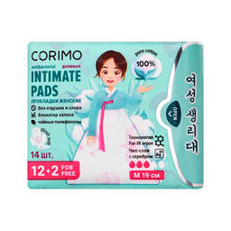 Гигиенические прокладки Corimo с хлопковым покрытием размера М (длина 19 см) подходят для использования в конце цикла или при скудных выделениях. В упаковке 14 ультратонких прокладок с крылышками с индексом впитываемости – «3 капли».
