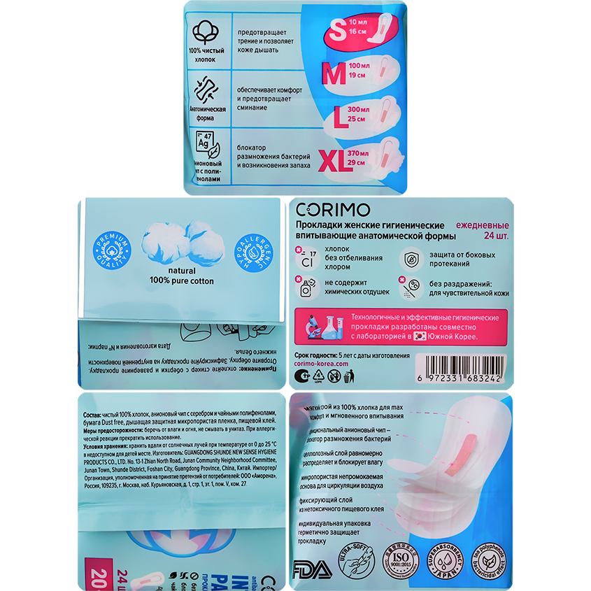 Технологичные и эффективные прокладки нового поколения разработаны совместно с лабораторией в Южной Корее. 100% натуральный чистый хлопок предотвращает трение и позволяет коже дышать. Безопасные материалы прокладки не вызывают раздражения и дискомфорта, а анатомическая форма предотвращает сминание. Прокладки Corimo содержат функциональный анионовый чип с наносеребром и чайными полифенолами, который блокирует размножение бактерий и возникновение запаха. Специальный целлюлозный распределяющий слой мгновенно равномерно распределяет и блокирует влагу. Для свободной циркуляции воздуха и профилактики размножения патогенной микрофлоры непромокаемая дышащая основа выполнена из микропористого материала. Прокладка крепится к белью с использованием нетоксичного пищевого клея. Каждая прокладка Corimo защищена от пыли и влаги герметичной индивидуальной упаковкой. Внешняя оригинальная упаковка имеет многократно закрывающийся клапан и прозрачные окошки.