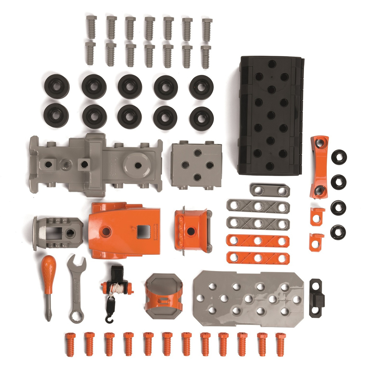 Комплектациясамосвал Black & Decker с большим количеством принадлежностей 60 аксессуаров: винты, колеса, составные компоненты, отвертка, гаечный ключ.