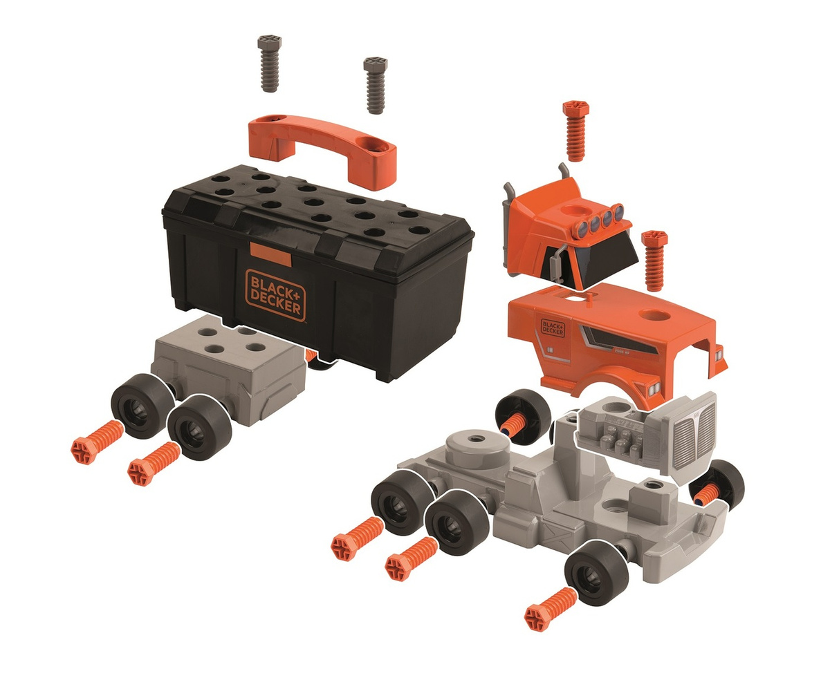 Комплектация:самосвал Black & Decker с большим количеством принадлежностей 60 аксессуаров: винты, колеса, составные компоненты, отвертка, гаечный ключ.