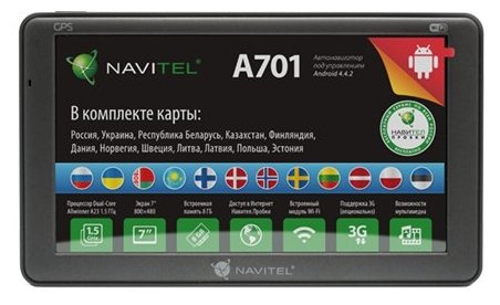 портативный, автомобильный, ПО: Навител, число каналов: 64, дисплей 7 дюйм., 800x480 пикс., USB, Wi-Fi, слот MicroSD, встроенная память: 8 Гб, голосовые сообщения, MP3-плеер, фото, видео