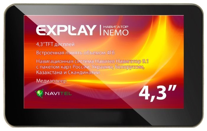 портативный, автомобильный, ПО: Навител, дисплей 4.3 дюйм., 480x272 пикс., USB, слот MicroSD, встроенная память: 4 Гб, голосовые сообщения, MP3-плеер, фото, видео