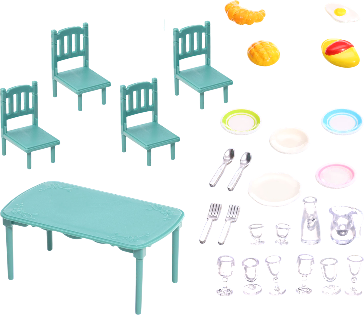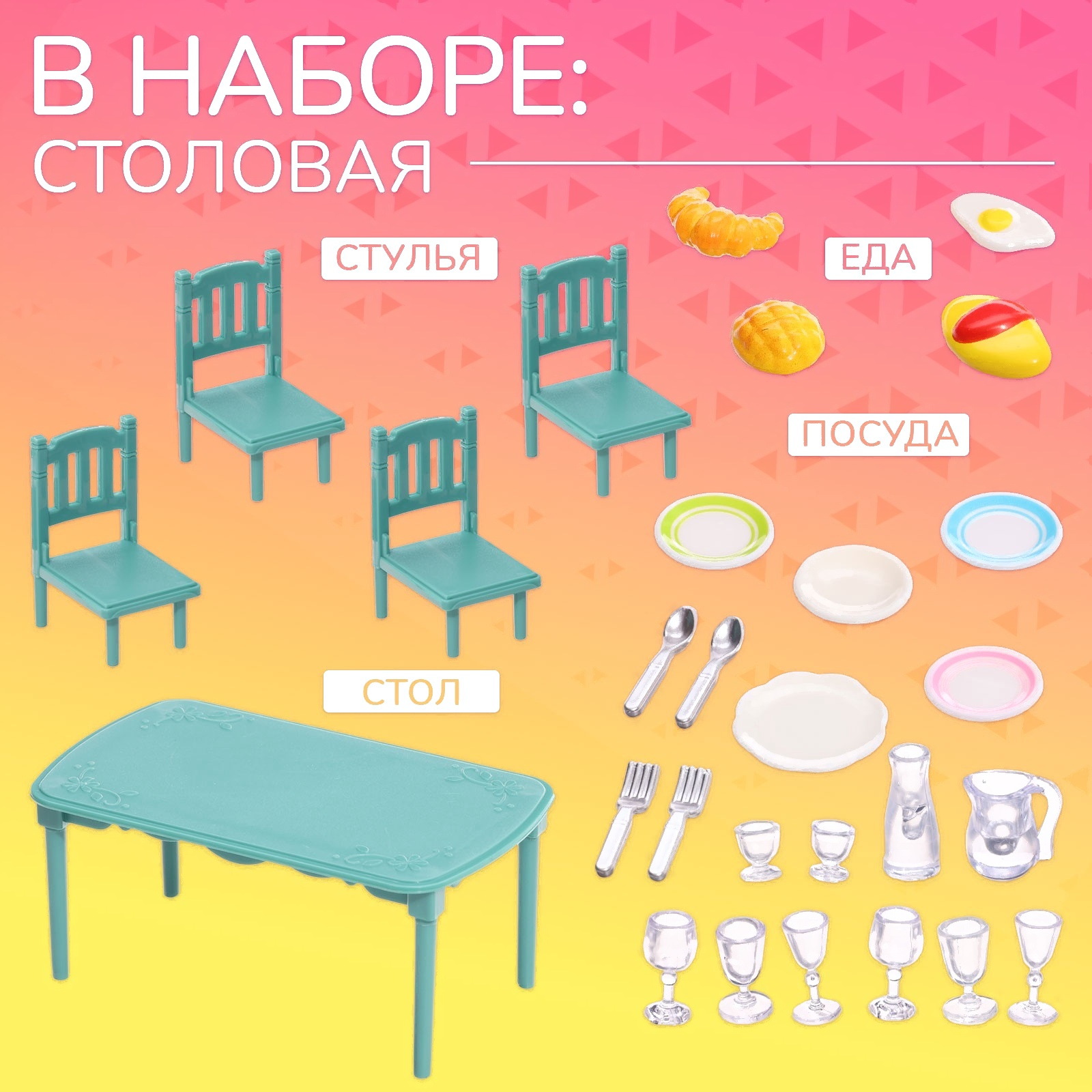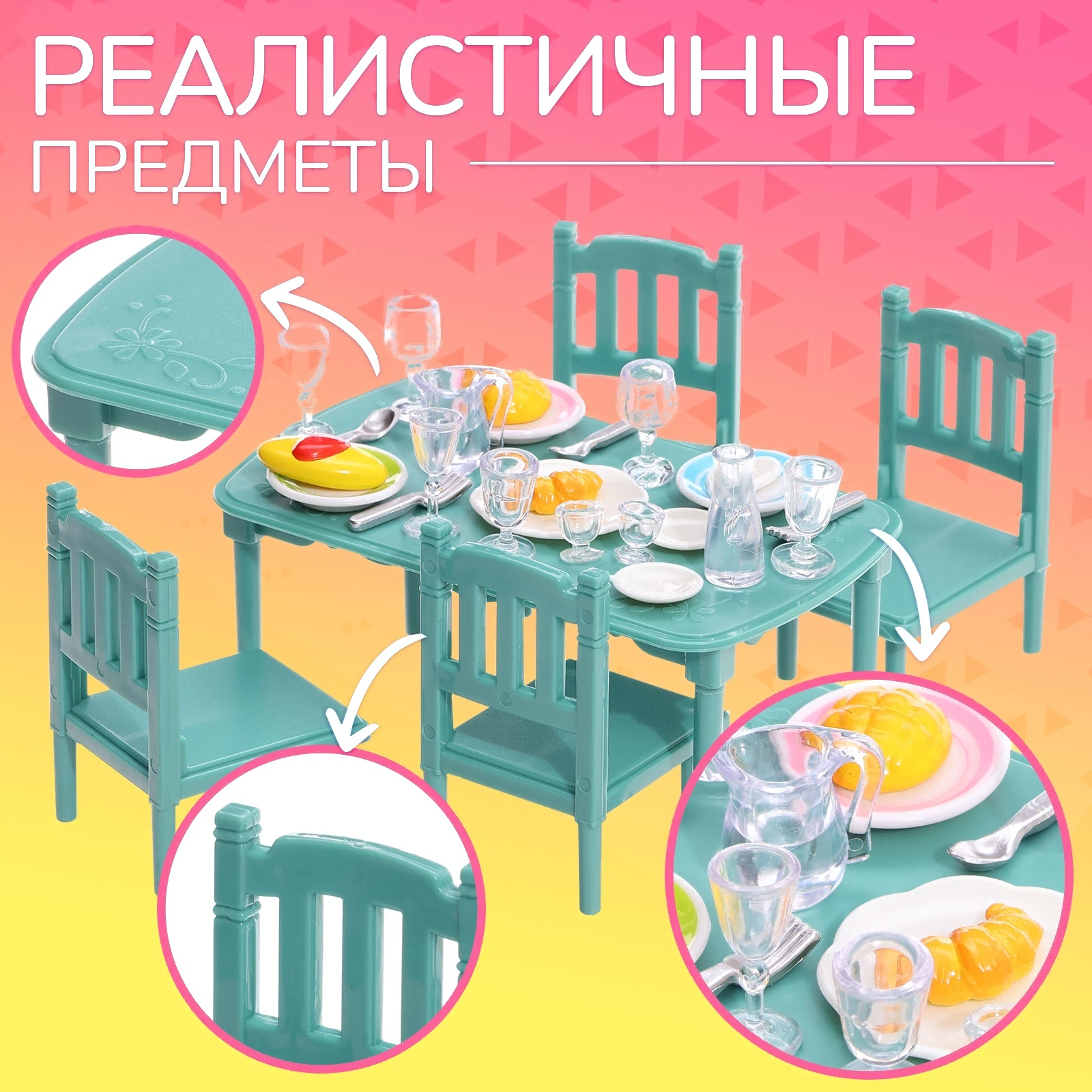 • Вид аксессуара стол, стул (4 шт.), посуда (19 шт.), еда/напитки (4 шт.)