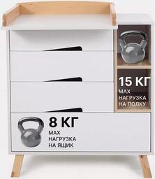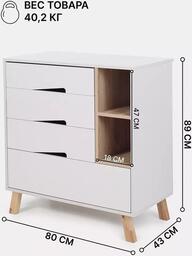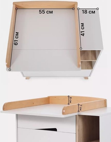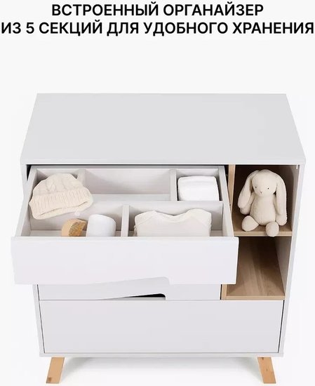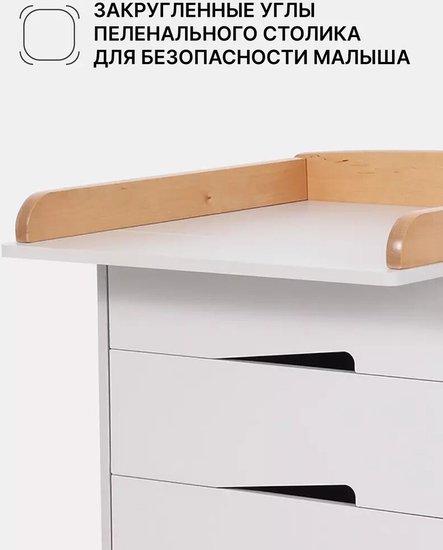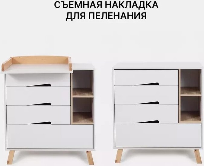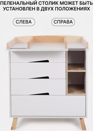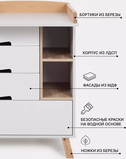 • Что особенного в этом комоде:особая архитектура комода выдаст в вас тонкого ценителя прекрасного комод дополнен бортиком, превращающим его в полноценный пеленальный столик. Бортик с безопасно закругленными краями можно установить в двух положениях - слева и справа. когда малыш подрастёт, бортик можно будет снять комфортная ширина комода позволит как переодевать малыша, так и хранить необходимые предметы гигиены рядомкомод включает в себя 2 открытые полки для быстрого доступа к предметам гигиены и важным вещам4 вместительных выдвижных ящика бесшумны - они не потревожат спящего кроху к тому же ящики дополнены телескопическими направляющими, благодаря которым комод способен выдерживать большие нагрузки на протяжении длительного времени также ящики дополнены удобными фигурными выпилами вместо ручек - вам не надо будет подкручивать разболтавшуюся фурнитуруверхний ящик комода разделен на 5 разноформатных секций, куда так удобно сложить все необходимые вещи для ухода за младенцем (подгузники, одноразовые пеленки, детскую косметику для тела)комод изготовлен из высококачественных и экологически чистых материалов обработан безопасными для здоровья младенца красками на водной основеДорогие родители, помните, что малыша нельзя оставлять одного на пеленальном комоде! Что особенного в этом комоде:особая архитектура комода выдаст в вас тонкого ценителя прекрасного комод дополнен бортиком, превращающим его в полноценный пеленальный столик. Бортик с безопасно закругленными краями можно установить в двух положениях - слева и справа. когда малыш подрастёт, бортик можно будет снять комфортная ширина комода позволит как переодевать малыша, так и хранить необходимые предметы гигиены рядомкомод включает в себя 2 открытые полки для быстрого доступа к предметам гигиены и важным вещам4 вместительных выдвижных ящика бесшумны - они не потревожат спящего кроху к тому же ящики дополнены телескопическими направляющими, благодаря которым комод способен выдерживать большие нагрузки на протяжении длительного времени также ящики дополнены удобными фигурными выпилами вместо ручек - вам не надо будет подкручивать разболтавшуюся фурнитуруверхний ящик комода разделен на 5 разноформатных секций, куда так удобно сложить все необходимые вещи для ухода за младенцем (подгузники, одноразовые пеленки, детскую косметику для тела)комод изготовлен из высококачественных и экологически чистых материалов обработан безопасными для здоровья младенца красками на водной основеДорогие родители, помните, что малыша нельзя оставлять одного на пеленальном комоде!