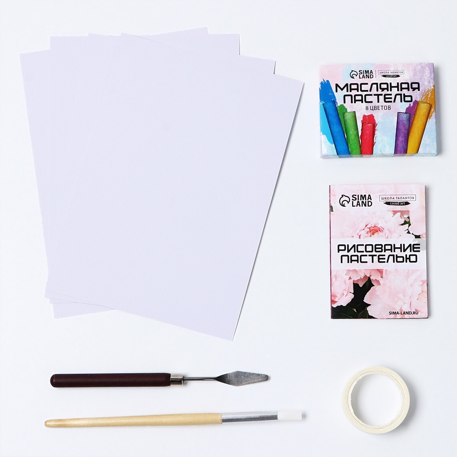 • Наполнение пастельные мелки, набор белой бумаги, кисть, мастихин, скотч