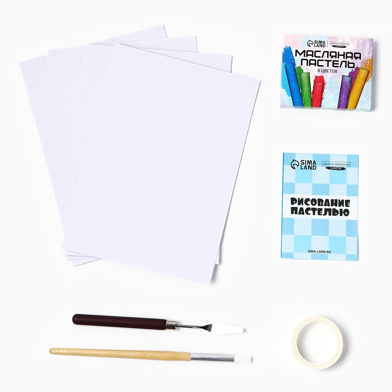 • Наполнение пастельные мелки, набор белой бумаги, кисть, мастихин, скотч