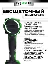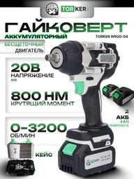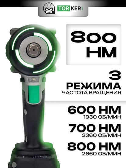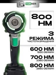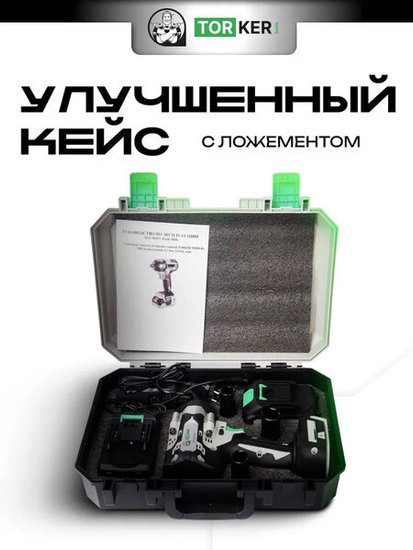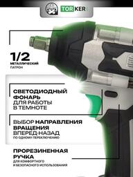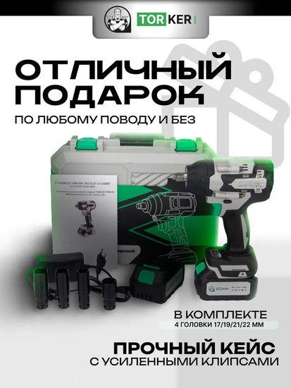 ✅Аккумуляторный гайковерт Torker WR20-04 - это мощный инструмент для профессионального и бытового использования. Благодаря бесщеточному двигателю и современному Li-Ion аккумулятору на 20 В с емкостью 4.0 А·ч, устройство обеспечивает высокую производительность и продолжительное время работы без подзарядки.✅Гайковерт оснащён ударным механизмом, что позволяет эффективно справляться с закручиванием и откручиванием крепежа даже при высоких нагрузках. Максимальный крутящий момент 800 Н·м и высокая частота ударов до 3300 ударов/мин обеспечивают быструю работу с различными материалами и гайками.✅Для удобства пользователя предусмотрены реверс, электронная регулировка скорости вращения (3 режима), а также встроенная подсветка, позволяющая работать в условиях плохой освещенности. В комплекте поставляются два аккумулятора, зарядное устройство, кейс и набор головок (17, 19, 21, 22 мм), что делает инструмент полностью готовым к эксплуатации сразу после покупки.✅Корпус эргономичной формы обеспечивает удобный хват, а компактные габариты позволяют использовать инструмент в труднодоступных местах. Гарантия 1 год и возможность дополнительной защиты позволят не беспокоиться о надежности и долговечности гайковерта.✅Аккумуляторный гайковерт Torker WR20-04 - это мощный инструмент для профессионального и бытового использования. Благодаря бесщеточному двигателю и современному Li-Ion аккумулятору на 20 В с емкостью 4.0 А·ч, устройство обеспечивает высокую производительность и продолжительное время работы без подзарядки.✅Гайковерт оснащён ударным механизмом, что позволяет эффективно справляться с закручиванием и откручиванием крепежа даже при высоких нагрузках. Максимальный крутящий момент 800 Н·м и высокая частота ударов до 3300 ударов/мин обеспечивают быструю работу с различными материалами и гайками.✅Для удобства пользователя предусмотрены реверс, электронная регулировка скорости вращения (3 режима), а также встроенная подсветка, позволяющая работать в условиях плохой освещенности. В комплекте поставляются два аккумулятора, зарядное устройство, кейс и набор головок (17, 19, 21, 22 мм), что делает инструмент полностью готовым к эксплуатации сразу после покупки.✅Корпус эргономичной формы обеспечивает удобный хват, а компактные габариты позволяют использовать инструмент в труднодоступных местах. Гарантия 1 год и возможность дополнительной защиты позволят не беспокоиться о надежности и долговечности гайковерта.
