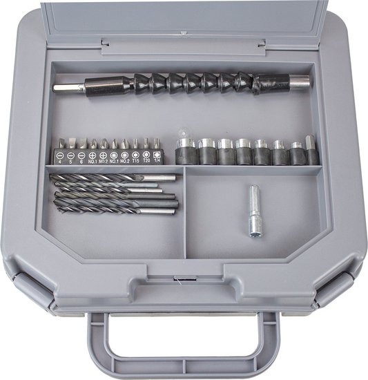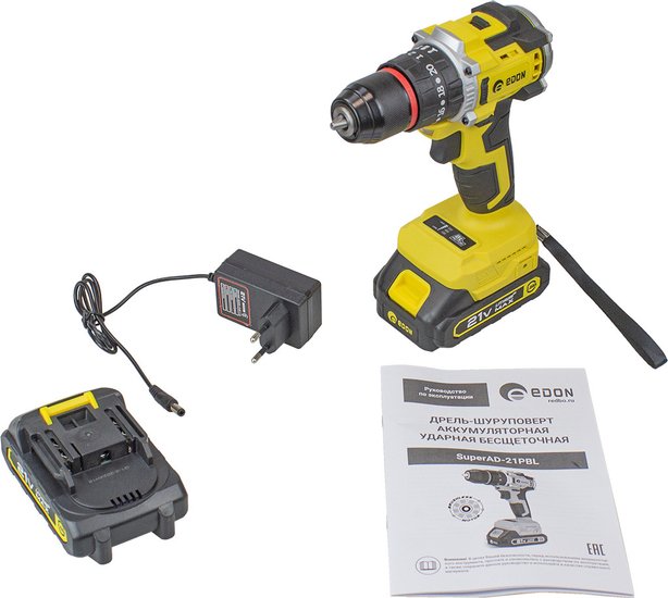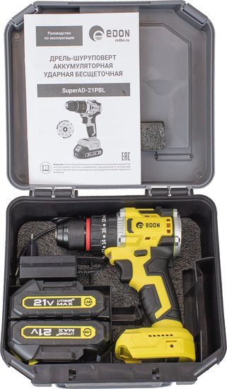 Комплектация- Дрель- Аккумуляторная батарея- Зарядное устройство- Гибкий вал- Набор сверел- Набор бит- Набор накидных головок- Переходник- Руководство по эксплуатации- Упаковка (кейс пластиковый)