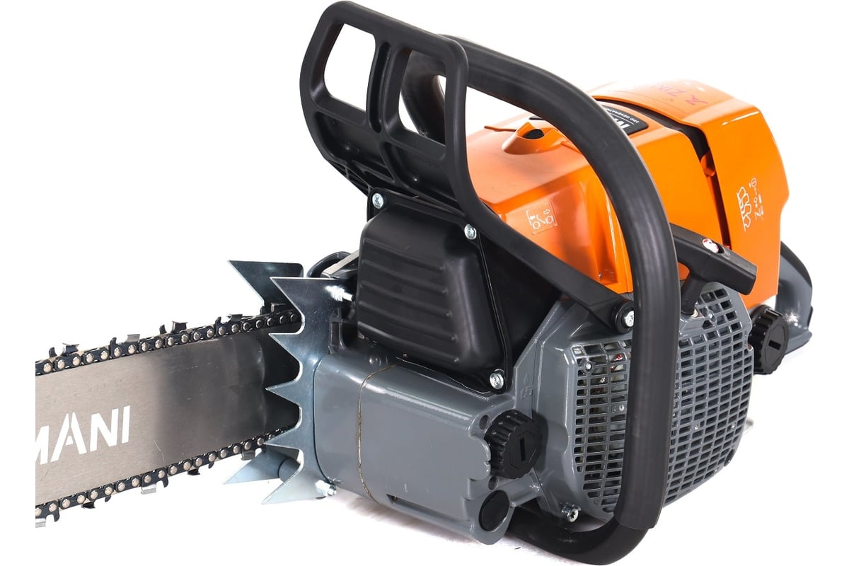 Бензопила ZimAni MS 660 18" это единственная в России пила для профессионального использования с объемом двигателя более 90 куб.см., возможностью установки цельносварных шин со сменными наконечниками до 120 см длиной. Мощность бензопилы ZimAni достигает 7-ми л.с. при максимальных оборотах двигателя 13500 об/мин. Мощная бензопила ZimAni MS 660 для профессионального использования, выдерживающая самые высокие нагрузки . Бензопила ZimAni MS 660 предназначена для использования в густом лесу и для распиловки твердой древесины . Бензопила MS 660 отлично подходит для тяжелой работы по валке деревьев диаметром от 50 см и для заготовки крупноразмерной древесины. Высокая мощность 5.4 кВт/7.0 лс. Стальная защита топливного бака и рукоятки. Двойной зубчатый упор. Профессиональный HD фильтр с фильтрующим элементом из полиэтилена имеет на 70 % более мелкие поры, чем у фильтров из нетканых материалов и полиамида, что позволяет ему эффективно отфильтровывать даже самую мелкую пыль. Кроме этого, он обладает хорошей масло- и водоотталкивающей способностью и благодаря этому очень легко очищается. Замена патрона фильтра с PET может осуществляться без помощи специального инструмента. Антивибрационная система ZimAni AVS позволяет снизить вибрационную нагрузку передаваемую от двигателя на рукояти пилы, тем самым позволяет снизить вибрационную нагрузку на руки оператора. Боковое устройство натяжения цепи. Доступ к натяжному винту бензопилы MS 660 обеспечивается сбоку через крышку цепной звёздочки. Это предотвращает контакт рук с острой цепью и кончиками зубчатого упора. Возможность работать в экстремальном режиме. Декомпрессионный клапан. При запуске двигателя выпускает часть сжатой смеси из цилиндра В результате требуемое усилие тяги на пусковом тросе заметно снижается вся система пуска менее интенсивно изнашивается Данное устройство пилы позволяет избавиться от остаточной компрессии и тем самым облегчает запуск Что в свою очередь облегчает работу оператору и уменьшает износ пусковой системы. Компенсатор ZimAni - регулирующий орган в карбюраторе, он обеспечивает почти постоянные мощность двигателя, качество выхлопа и расход топлива в течение длительного времени несмотря на увеличивающееся загрязнение воздушного фильтра. Прочищать воздушный фильтр требуется только при ощутимом падении мощности. Становится возможной работа в течение длительного времени без техобслуживания. Комплектуется профессиональными цельносварными шинами до 120 см длиной и профессиональными цепями ZimAni из немецкой стали. Управление дроссельной заслонкой, необходимое для холодного и горячего запуска, а также выключения пилы, управляется одним отдельным рычагом, что делает управление более комфортным и безопасным, так как нет необходимости использовать обе руки. Регулируемый маслонасос, который позволяет увеличивать или уменьшать подачу масла, в зависимости от ситуации, такой как пересушенная древесина или длинная режущая гарнитура Сварная шина ZimAni Welded Bar имеет сверхпрочную сварную конструкцию, что обеспечивает максимальную жесткость и прочность Бензопила. Инструкция по эксплуатации. Шина ZimAni 18" 3/8", 1,6 мм., 66E. Пильная цепь ZimAni 18" 3/8", 1,6 мм., 66E. Канистра для приготовления смеси. Отвертка. Свечной ключ. Сумка для хранения аксессуаров.