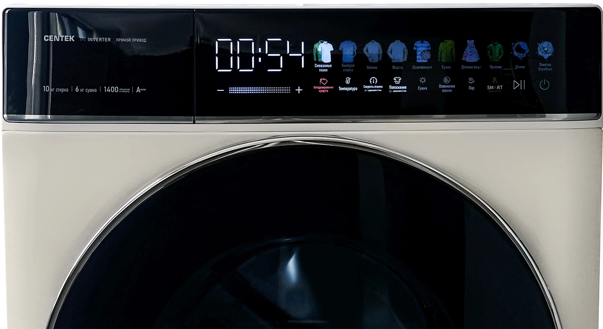 • Программы (полное описание) Смешанные ткани, Быстрая стирка, Хлопок, Шерсть, Дезинфекция, Сушка, Детские вещи, Пуховик, Отжим, Очистка барабана, Очистка сушильного канала, SMART