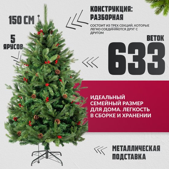 ✅ Искусственная ель «Winter Fun Drop / SP2232-150» — отличный вариант для создания уютной атмосферы в любом интерьере. Изготовленная из качественного PE-полиэтилена и ПВХ, она отличается долговечностью и реалистичным внешним видом. Натуральные элементы, такие как шишки и ягоды, придают ей особую привлекательность и создают праздничное настроение.✅ С высотой 1.5 м и диаметром 100 см, эта ель идеально впишется в небольшие помещения, добавляя стиль и уют. Конструкция включает 5 ярусов и 633 ветки, что обеспечивает пышность и объем. Удобное крепление веток на шарнирах позволяет легко регулировать форму, а разборная конструкция из 3 секций упрощает установку и хранение. Металлическая подставка гарантирует надежность и устойчивость.✅ Искусственная ель с натуральными украшениями подходит как для домашнего использования, так и для общественных мест. Ее универсальный дизайн позволяет легко сочетать с разнообразными украшениями, добавляя индивидуальности в оформление. Простота установки и надежность конструкции делают эту ель практичным выбором для долгосрочного использования.⚠️ Ель Winter Fun Drop станет прекрасным дополнением к новогодним праздникам, создавая атмосферу волшебства и радости. Искусственная ель для праздничного декора поможет создать уникальную атмосферу и незабываемые моменты в кругу семьи и друзей.✅ Искусственная ель «Winter Fun Drop / SP2232-150» — отличный вариант для создания уютной атмосферы в любом интерьере. Изготовленная из качественного PE-полиэтилена и ПВХ, она отличается долговечностью и реалистичным внешним видом. Натуральные элементы, такие как шишки и ягоды, придают ей особую привлекательность и создают праздничное настроение.✅ С высотой 1.5 м и диаметром 100 см, эта ель идеально впишется в небольшие помещения, добавляя стиль и уют. Конструкция включает 5 ярусов и 633 ветки, что обеспечивает пышность и объем. Удобное крепление веток на шарнирах позволяет легко регулировать форму, а разборная конструкция из 3 секций упрощает установку и хранение. Металлическая подставка гарантирует надежность и устойчивость.✅ Искусственная ель с натуральными украшениями подходит как для домашнего использования, так и для общественных мест. Ее универсальный дизайн позволяет легко сочетать с разнообразными украшениями, добавляя индивидуальности в оформление. Простота установки и надежность конструкции делают эту ель практичным выбором для долгосрочного использования.⚠️ Ель Winter Fun Drop станет прекрасным дополнением к новогодним праздникам, создавая атмосферу волшебства и радости. Искусственная ель для праздничного декора поможет создать уникальную атмосферу и незабываемые моменты в кругу семьи и друзей.