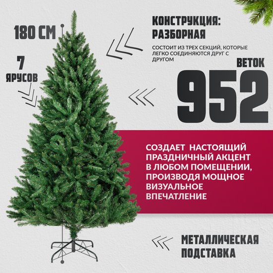 ✅ Искусственная ель «Winter Fun Drop / S2306-180» — идеальный выбор для создания уютной праздничной атмосферы в любом интерьере. С высотой 1.8 м и диаметром 110 см, она станет стильным акцентом, добавляя зелень и свежесть в ваше пространство. Мягкая «хвоя» из ПВХ создает эффект натурального дерева, что делает ель привлекательной для оформления как жилых, так и коммерческих помещений.✅ Цельная конструкция и три секции обеспечивают простоту установки и надежность. Металлическая подставка гарантирует устойчивость, что способствует долговечности использования. С количеством от 952 веток, ель выглядит пышной и объемной, создавая атмосферу праздника. Крепление веток на шарнирах облегчает сборку, что удобно в процессе подготовки к торжествам.✅ Эта искусственная ель для новогоднего декора станет привлекательным элементом, который будет радовать глаз и добавлять уют. Высота 1.8 м подходит для помещений с различной высотой потолков, а мягкая хвоя безопасна для детей и домашних животных. Цельная конструкция способствует легкости установки и стабильности, а упаковка в коробке упрощает транспортировку и хранение.⚠️ Winter Fun Drop прекрасно подходит для оформления как традиционного, так и современного новогоднего стиля. Использование этой ели способствует созданию теплоты и уюта в доме. Искусственную ель можно приобрести в любое время года, чтобы всегда быть готовым к праздникам и радовать близких красивым оформлением.✅ Искусственная ель «Winter Fun Drop / S2306-180» — идеальный выбор для создания уютной праздничной атмосферы в любом интерьере. С высотой 1.8 м и диаметром 110 см, она станет стильным акцентом, добавляя зелень и свежесть в ваше пространство. Мягкая «хвоя» из ПВХ создает эффект натурального дерева, что делает ель привлекательной для оформления как жилых, так и коммерческих помещений.✅ Цельная конструкция и три секции обеспечивают простоту установки и надежность. Металлическая подставка гарантирует устойчивость, что способствует долговечности использования. С количеством от 952 веток, ель выглядит пышной и объемной, создавая атмосферу праздника. Крепление веток на шарнирах облегчает сборку, что удобно в процессе подготовки к торжествам.✅ Эта искусственная ель для новогоднего декора станет привлекательным элементом, который будет радовать глаз и добавлять уют. Высота 1.8 м подходит для помещений с различной высотой потолков, а мягкая хвоя безопасна для детей и домашних животных. Цельная конструкция способствует легкости установки и стабильности, а упаковка в коробке упрощает транспортировку и хранение.⚠️ Winter Fun Drop прекрасно подходит для оформления как традиционного, так и современного новогоднего стиля. Использование этой ели способствует созданию теплоты и уюта в доме. Искусственную ель можно приобрести в любое время года, чтобы всегда быть готовым к праздникам и радовать близких красивым оформлением.