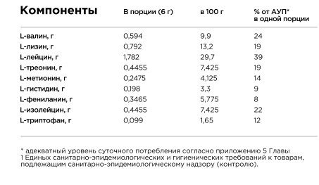 - Состав Комплекс аминокислот (L-лейцин, L-изолейцин, L-валин, L-лизин, L-метионин, L-треонин, L-фениланин, L-гистидин, L-триптофан)Антиокислитель (аскорбиновая кислота)Регуляторы кислотности (лимонная кислота, яблочная кислота)Ароматизаторы натуральныеКраситель натуральныйПодсластители (сукралоза)