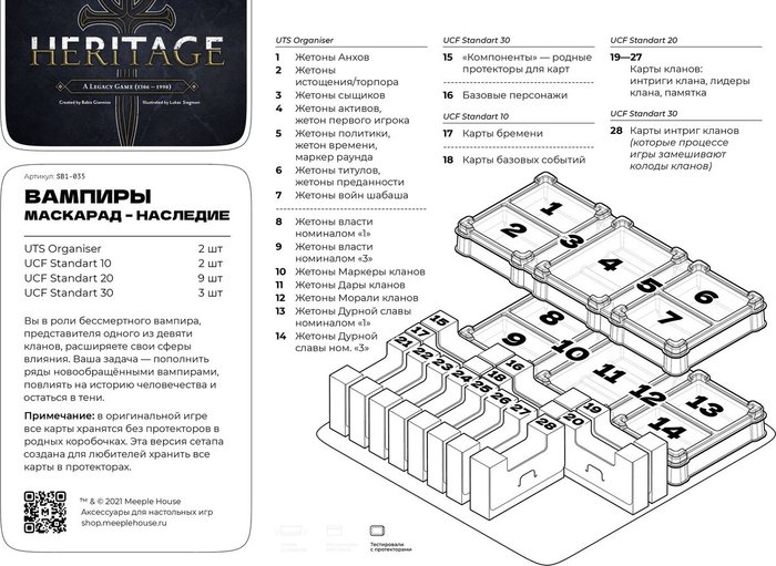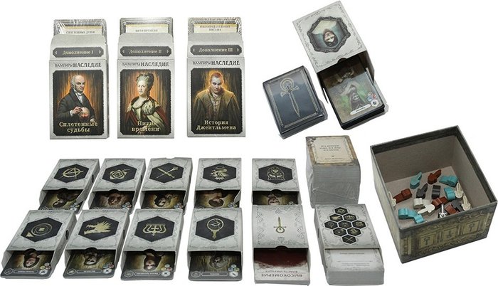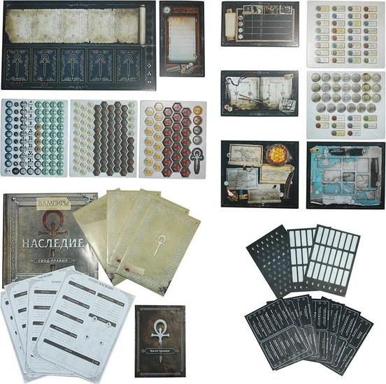 - Комплектация Игровое поле; Поля боя; Базовые персонажи; Интриги кланов; Персонажи Хроники; Лидеры Кланов; Карты Бремени; Памятки Игроков; Итоги Хроники; Интриги Полей Боя; Правила Полей Боя; Базовые События; События Хроники; Обзор Глав; Финальное Событие; Активы; Деревянные Анхи; Дары; Маркеры Кланов; Жетоны Морали Кланов; Жетоны Клановой Политики; Жетон первого игрока; Истощение / Торпор; Марке Раунда; Власть / Дурная Слава (ценность 1); Власть / Дурная Слава (ценность 3); Жетоны Войн Шабаша; Жетоны Преданности; Жетоны Титулов; Жетон Времени; Жетоны Сыщиков; Убежище Игрока; Лист Персонажа Игрока; Буклет Хроники; Колода Хроники; Колода Исследования; Листы с Наклейками; Протекторы; Правила игры на русском языке.
