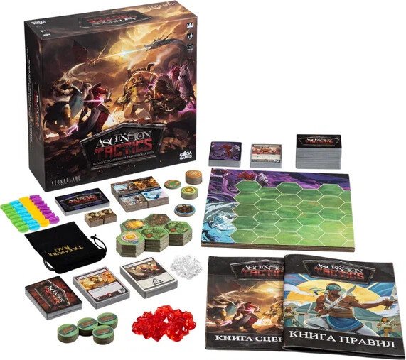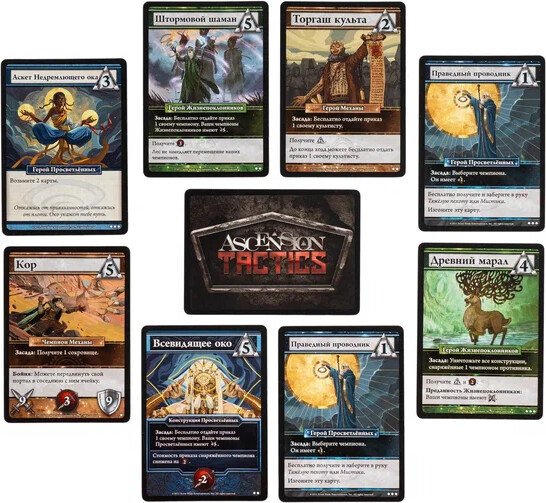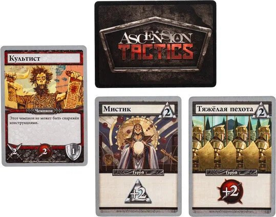Ascension Tactics — тактический файтинг в легендарной вселенной Вигила. Настоящий взрывной коктейль из механик — колодострой и ураганный скирмиш на арене. Такого ядерного сочетания вы ещё точно не встречали! Соберите асимметричную команду чемпионов, прокачайте колоду могущественными картами и уничтожьте всех соперников на своём пути.Об игре.В незапамятные времена один из пяти богов — Самаэль, известный как Падший, — восстал против своих собратьев. Их война расколола реальность на пять осколков, а Самаэль был навеки низвергнут в Пустоту. Теперь, вырвавшись из тысячелетнего заточения, он хочет захватить процветающие земли Вигила и отомстить своим братьям. Помня о последствиях прошлой битвы, четверо богов отправляют на помощь в Вигил представителей своих миров.Tactics — новая серия тактических файтингов, основанная на колодостроительной механике именитого декбилдинга Ascension. Собирайте и разыгрывайте невероятные комбинации карт, чтобы наделять своих чемпионов дополнительными способностями, управлять ими на поле боя и даже нанимать новых. Прорывайтесь и берите под контроль ключевые точки — ваш главный источник славы и победных очков.Любители колодостроев оценят проверенную годами механику из классического Ascension. Здесь вам и карты разных фракций, взаимодействующих между собой, и разные ресурсы, и карты конструкций, которые усиливают ваших чемпионов. А фанаты файтингов будут в восторге от тактического планирования на поле битвы с занятием выгодных позиций, хитрыми манёврами и прямым конфликтом с игроками.А знаете, что делает эту игру мегауниверсальной? Невероятное количество режимов, которые гибко подстраиваются под любой состав. Дуэльные поединки, командные сражения 2 × 2 и безбашенные зарубы для 3–4 человек, где каждый сам за себя. Есть даже вариант с оверлордом — один злодей против двоих игроков. Если и этого мало, то пожалуйста — сюжетная кампания для 1–2 игроков и множество кооперативных сценариев. А если смешать базу с продолжением серии Ascension Tactics: Инферно, вы получите практически бесконечное разнообразие!Вы всегда начинаете игру с довольно слабой базовой колодой из 10 карт. Постепенно вы будете приобретать с рынка новые карты с улучшенными свойствами: бонусами для чемпионов, чисткой колоды, добором карт, ресурсами и многим другим. Всего в игре есть два ресурса: руны, необходимые для покупки новых карт, и сила, с помощью которой вы активируете чемпионов или побеждаете монстров.Собрав на картах в руке необходимую силу, вы можете активировать любое количество своих чемпионов. Каждый из них совершает только одно действие перемещения и атаки. Разыгрывая вспомогательные карты, вы можете усиливать их движение, урон и защиту. Если чемпиона сразили, он уходит с поля, но при следующей активации снова появится на месте вашего портала и продолжит битву.Цели в разных сценариях могут отличаться, но чаще всего вы будете зарабатывать очки славы за контроль над святилищами. Славу получит игрок с наибольшим суммарным количеством чемпионов возле святилища. Самый решительный и бесстрашный игрок — первым набравший нужное количество очков славы — возносится к богам и становится великим чемпионом Вигила!Ascension Tactics — тактический файтинг в легендарной вселенной Вигила. Настоящий взрывной коктейль из механик — колодострой и ураганный скир