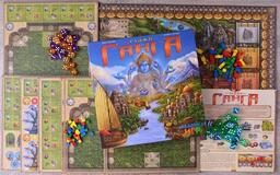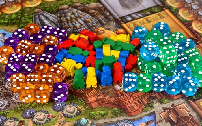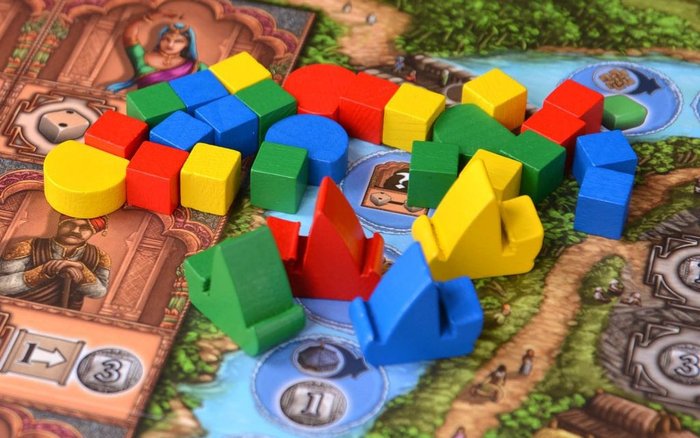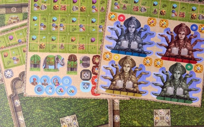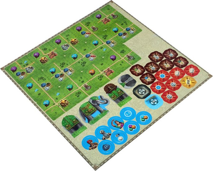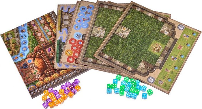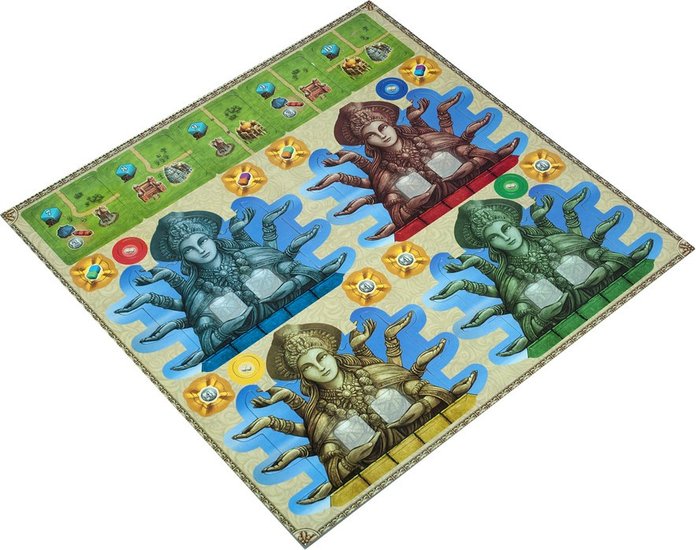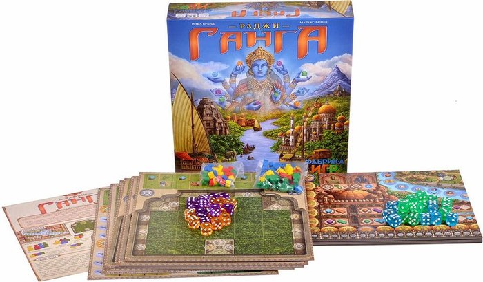 Комплектация1 двухстороннее игровое поле; 4 планшета провинций; 4 статуи богини Кали; 48 кубиков (по 12 каждого цвета); 64 тайла провинции (по 16 каждого цвета); 24 рабочих (по 6 каждого цвета); 4 лодки (по 1 каждого цвета); 4 маркера денег (по 1 каждого цвета); 2 тайла накладки; 4 бонусных маркера; 20 маркеров (по 5 каждого цвета); 4 маркера славы (по 1 каждого цвета); 1 слон первого игрока; 30 тайлов дохода; 8 тайлов реки; Правила игры на русском языке.