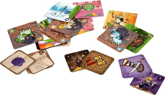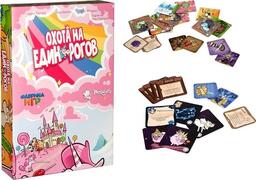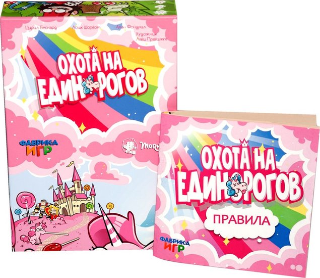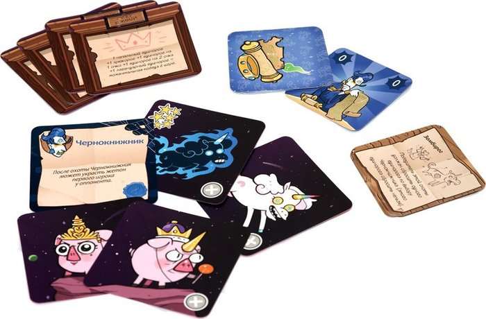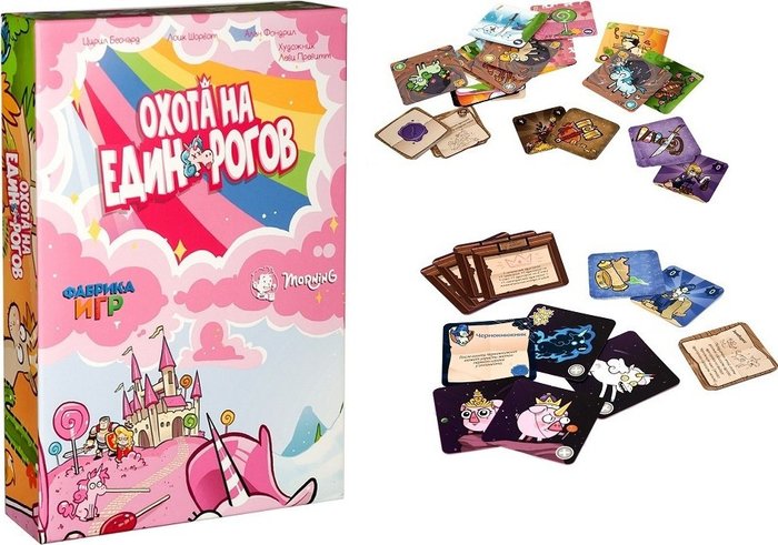 Комплектация141 карта, 20 жетонов чёрного рынка, жетон первого игрока, карта подсчёта очков, дополнение №1 (22 карты единорогов, 2 карты персонажей, 16 карт охоты, 16 карт хитростей, 6 карт с правилами для дополнения), дополнение №2 (4 карты единорогов, карта персонажа, 8 карт охоты, 8 карт хитростей, 6 карт чёрного рынка)