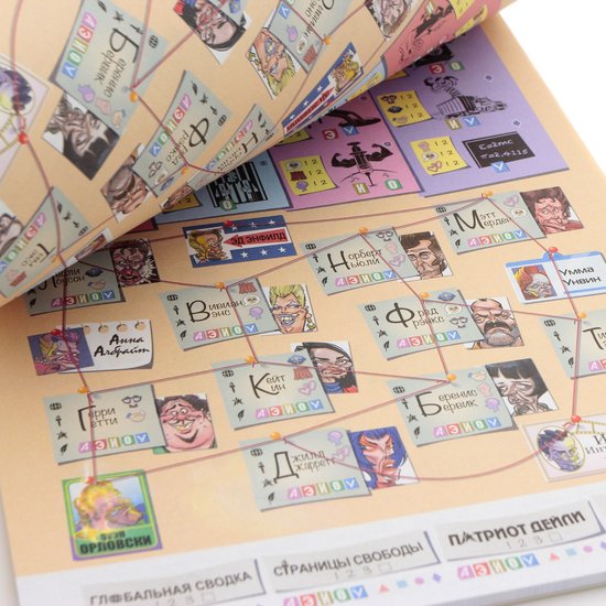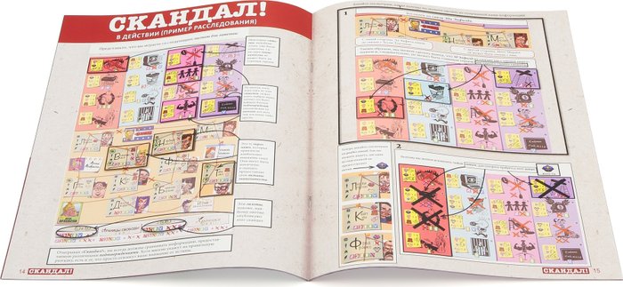 Комплектация250 пронумерованных карт, 1 фотокамера для стопки сброса, 1 блокнот с листами для заметок, 1 жетон первого игрока, 6 жетонов для разрешения скандалов, 6 ширм игроков, 9 жетонов предложений, 1 планшет расследования, 3 жетона расследования, буклет правил