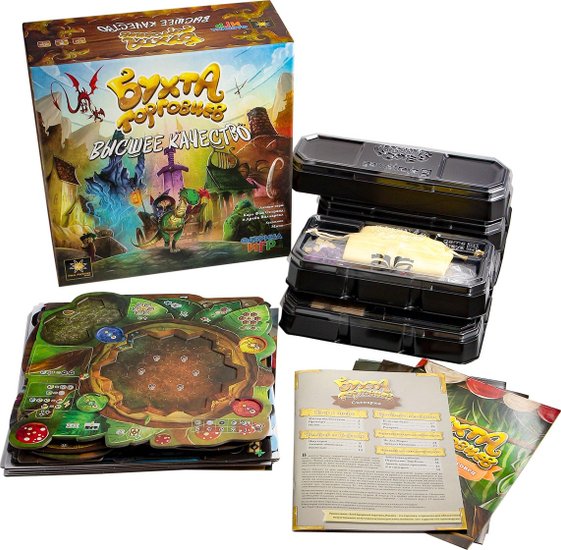 Комплектация1 планшет Фестиваля Гильдий, 1 жетон зала Гильдии паладинов, 1 жетон Начала фестиваля, 5 жетонов персонала на полставки, 5 жетонов 5-й ячейки действий персонала, 48 карт Горожан, 9 карт Чудовищ залива, 7 карт разбойников, 8 карт паладинов, 7 паладинов, 15 помощников, 12 витрин, 16 жетонов рекламы, 24 жетона чести, 7 товаров паладинов и 7 пластиковых подставочек, 1 буклет правил, 4 буклета правил торговцев, 1 таблица совместимости модулей, 1 буклет правил для соло-режима, 1 книга сценариев