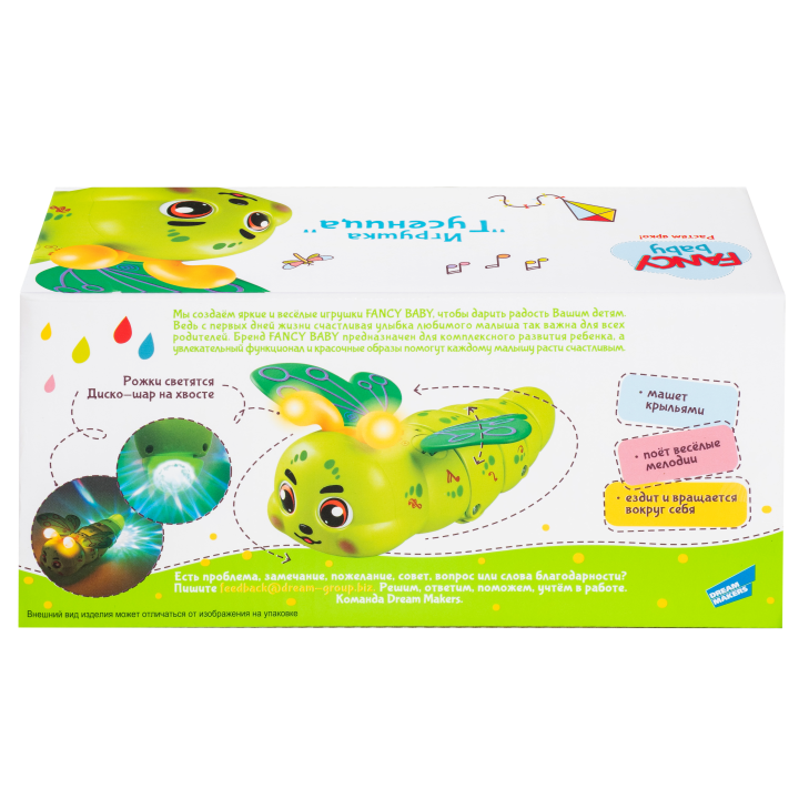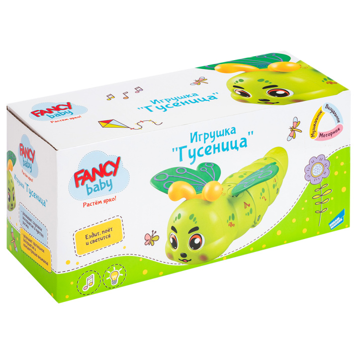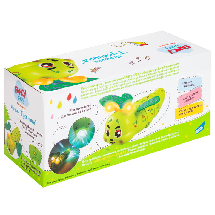 Яркая развивающая игрушка для детей от бренда FANCY BABY. Гусеница с подвижными крылышками и световыми эффектами стимулирует активность и развитие малыша. Игрушка проигрывает веселые мелодии и подходит как для активных игр, так и для использования в качестве ночника.