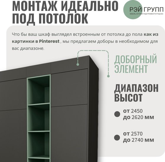✅ Шкафы коллекции «Рэй» — это идеальное решение для тех, кто ищет готовую мебель, не желая ждать изготовления. Они прекрасно вписываются в ниши, углы или вдоль стен, что делает их отличным выбором для компактных пространств.✅ Высота шкафов можно легко регулировать с помощью доборных элементов, что позволяет адаптировать их под любые условия — от 2450 мм до 2620 мм и от 2570 мм до 2740 мм. Фасады шкафов достигают пола, что создает стильный и современный вид без видимого цоколя.✅ Используемая фурнитура от Blum и Hafele обеспечивает надежность и долговечность. Доводчики и TipOn-механизмы делают открытие и закрытие дверей максимально комфортным. Регулируемые металлические опоры помогают компенсировать неровности пола, а крепления защищены от опрокидывания, что гарантирует безопасность.⚠️ Шкафы изготовлены из ЛДСП класса Е0,5, что подтверждает их высокое качество и безопасность для здоровья. Выбирая шкафы «Рэй», вы получаете стильную и функциональную мебель, которая прослужит вам долгие годы.✅ Шкафы коллекции «Рэй» — это идеальное решение для тех, кто ищет готовую мебель, не желая ждать изготовления. Они прекрасно вписываются в ниши, углы или вдоль стен, что делает их отличным выбором для компактных пространств.✅ Высота шкафов можно легко регулировать с помощью доборных элементов, что позволяет адаптировать их под любые условия — от 2450 мм до 2620 мм и от 2570 мм до 2740 мм. Фасады шкафов достигают пола, что создает стильный и современный вид без видимого цоколя.✅ Используемая фурнитура от Blum и Hafele обеспечивает надежность и долговечность. Доводчики и TipOn-механизмы делают открытие и закрытие дверей максимально комфортным. Регулируемые металлические опоры помогают компенсировать неровности пола, а крепления защищены от опрокидывания, что гарантирует безопасность.⚠️ Шкафы изготовлены из ЛДСП класса Е0,5, что подтверждает их высокое качество и безопасность для здоровья. Выбирая шкафы «Рэй», вы получаете стильную и функциональную мебель, которая прослужит вам долгие годы.