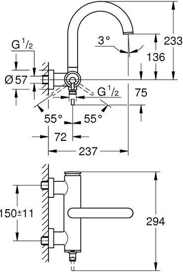 - Длина (вылет) излива 237 мм