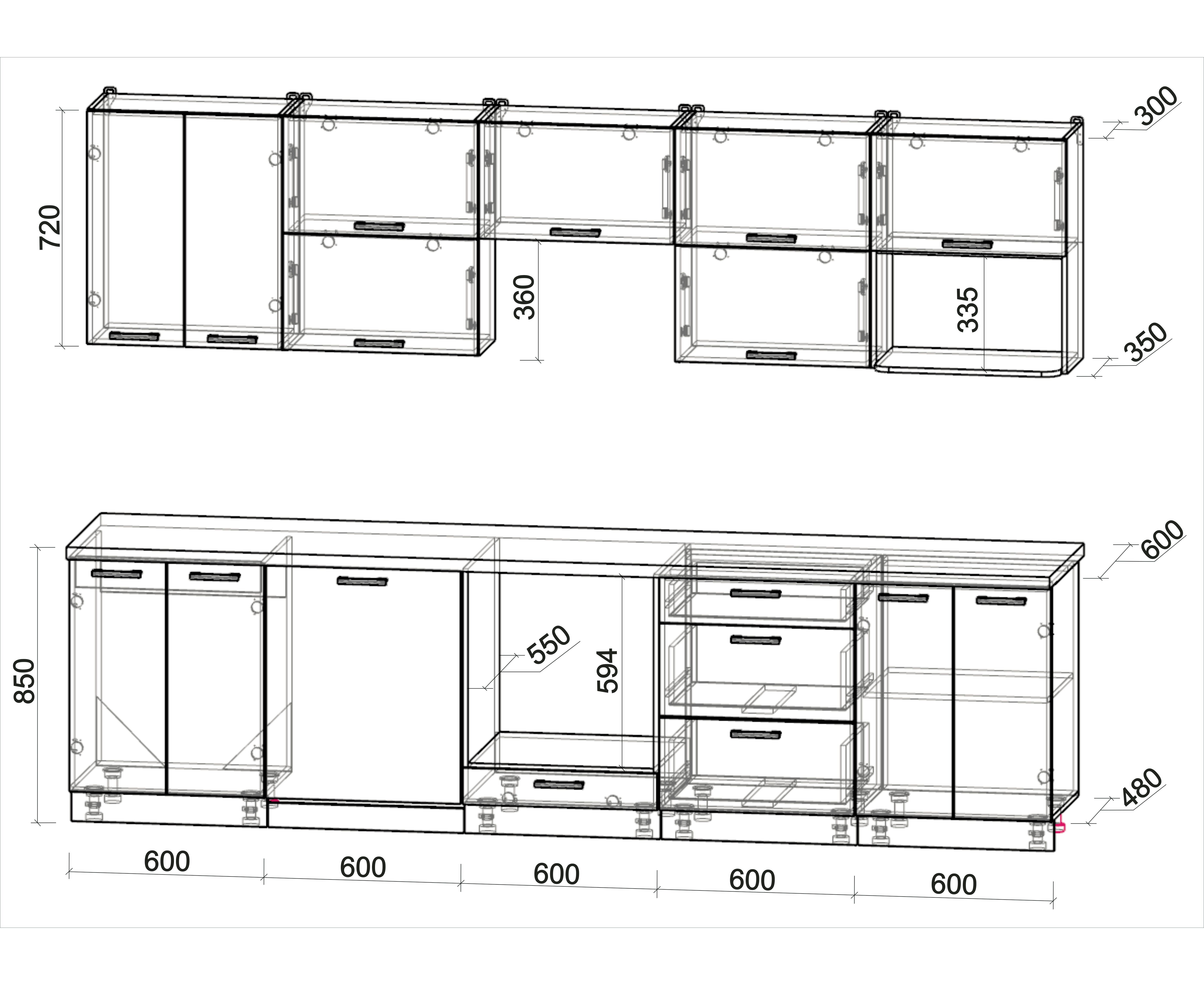 - Глубина нижних шкафов (по столешнице) 600 мм