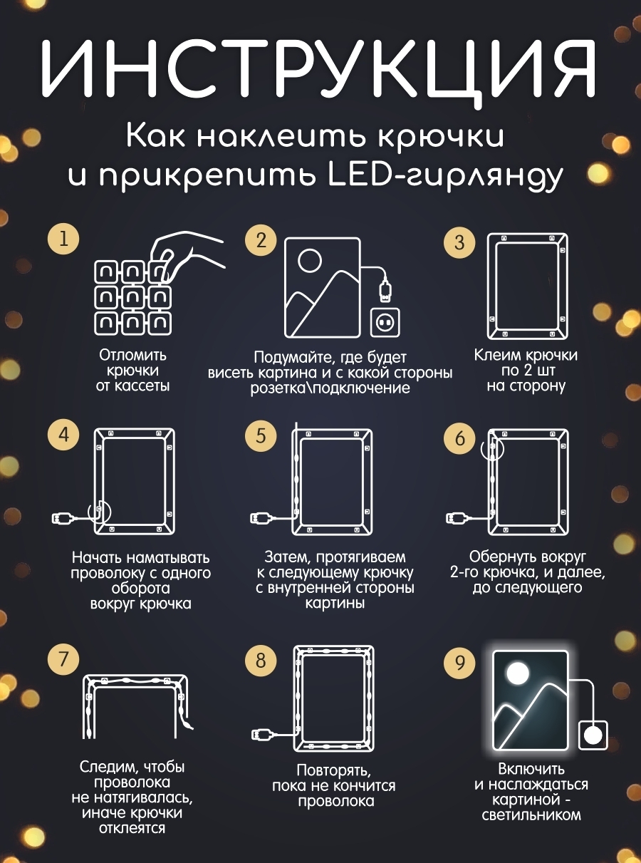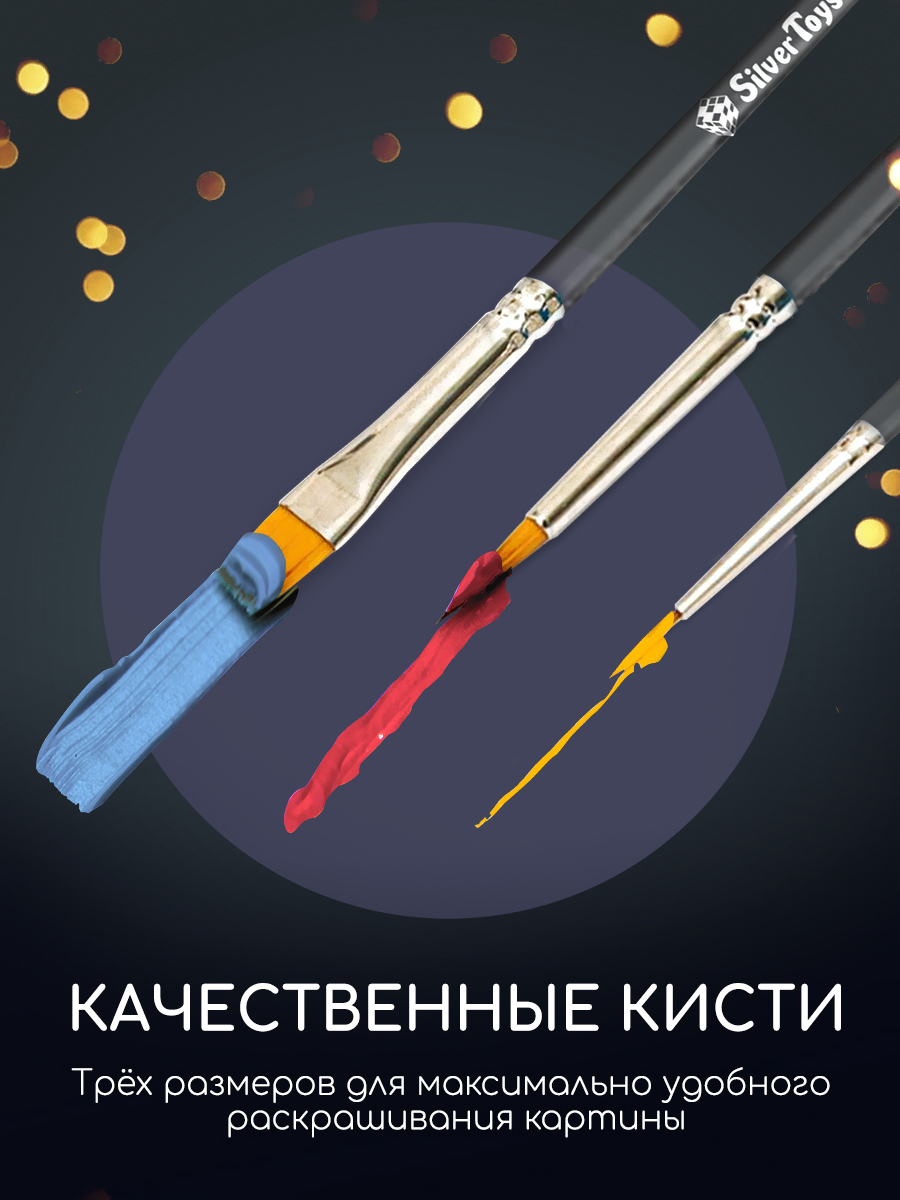 • Комплектация набора гирлянда, пульт, крепление, холст, кисти, краски
