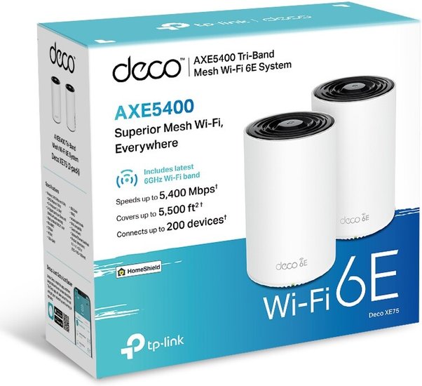 - Комплектация - Deco XE75 (2 шт.)- Блоки питания (2 шт.)- Кабель Ethernet (2 шт.)- Документация