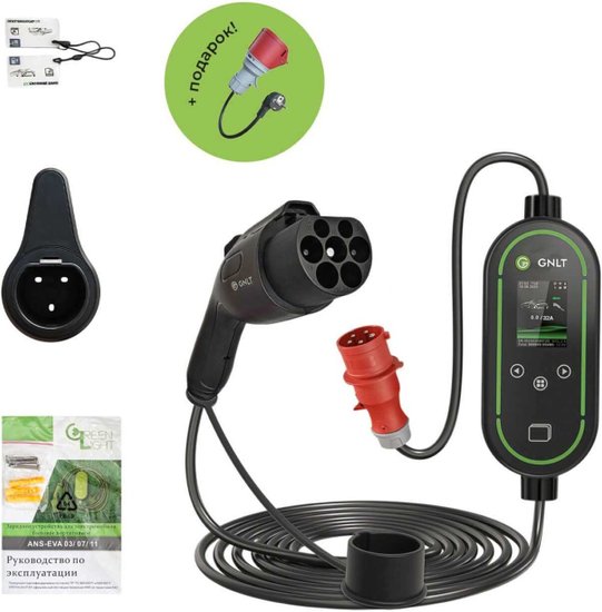 Эта однофазная модель подходит для электромобилей с портом GB/T. Красная вилка с датчиком температуры подключается к розеткам 380В на 32А (но потребляет только одну фазу) и контролирует температуру в реальном времени.А для полного удобства, каждому покупателю мы дарим еще и переходник для бытовой сети, чтобы зарядить электромобиль можно было в любом месте.Главное достоинство зарядного устройства — надежная защита от пыли и влаги по стандарту IP67, что позволяет использовать его на улице круглый год. К тому же, эта модель оснащена максимально полным набором систем безопасности.Максимальная мощность ее достигает 7 кВт, а гибкая регулировка тока с шагом в 1А и настройка расписания зарядки обеспечивают комфортное использование. Поддержка русского языка делает работу с устройством простой и понятной.Обзор корпуса и настроек зарядного устройстваНа блоке управления установлен 2,4-дюймовый ЖК-экран, на котором отображаются все ключевые параметры зарядной сессии: мощность и напряжение сети, потребленные киловатты, дата и время, температура, количество фаз и длительность зарядки. При активированном расписании виден обратный отсчет.Под дисплеем находятся три кнопки для входа в меню и изменения настроек, ниже расположена зона считывания RFID-карт. Интерфейс можно переключить на русский язык.Контур блока оснащен световой индикацией, которая меняет цвет в зависимости от режима работы. Яркость дисплея регулируется, а также можно настроить автоматическое отключение экрана и LED-подсветки через определенное время.Такое сочетание элементов обеспечивает простой и наглядный контроль над процессом зарядки.Регулировка силы токаФункция ручной регулировки тока позволяет адаптировать зарядку под условия вашей электросети. Особенно полезно это там, где проводка старая, напряжение нестабильное или мощности не хватает для всех используемых в моменте приборов.Вы можете установить силу тока в диапазоне от 6 до 32 ампер, с шагом всего 1 ампер, чтобы зарядка проходила безопасно, а сеть не перегружалась. Важно помнить, что регулировка выполняется до подключения устройства к электромобилю.Дополнительно предусмотрена интеллектуальная настройка ампеража, которая автоматически снижает силу тока при падении напряжения, удерживая его в пределах безопасного уровня для стабильной зарядки вашей машины.Система безопасности и повышенная пылевлагозащитаБезопасность этой модели продумана до мелочей. Устройство оснащено полным комплектом защит: от утечки тока (AC 30 мА / DC 6 мА), пониженного и повышенного напряжения, перегрузки, перегрева и короткого замыкания.УЗО Type B обеспечивает защиту дома: при утечке постоянного тока из электромобиля домашние приборы остаются в безопасности.Отличительная особенность — встроенный в вилку термодатчик. Если температура превышает 95 °C более 10 секунд, зарядка автоматически прерывается. А после охлаждения до 75 °C, сессия возобновляется в штатном режиме.Варианты запуска электрозаправкиС GNLT EVE07 GB/T вы сами решаете, как стартовать зарядную сессию:Plug&Charge:подключили коннектор, и зарядка начинается автоматически.RFID-карты:можно привязать до шести карт. Управление через считыватель на блоке гарантирует доступ только владельцам карт и позволяет отслеживать потребление по каждому пользователю.Расписание:до трех графиков с учетом 