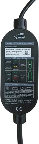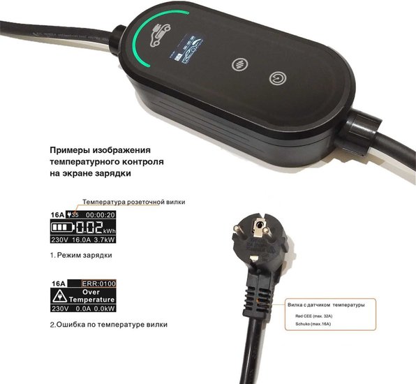 Премиальное зарядное устройство для электромобилей с американским портом зарядки Type 1. Изготовлено из качественных компонентов с высоким запасом прочности.Максимальная сила тока — 16 Ампер, что равно 3,5 киловаттам. С возможностью регулировки силы тока, таймером отложенного старта и высокой степенью защиты от влаги — IP67.Это однофазное зарядное устройство для бытовых розеток. Розеточная вилка оснащена датчиком температуры, что повышает безопасность во время зарядки. Дальше подробнее описаны преимущества данной модели.Ручная регулировка силы тока и дисплейВ настройках доступен диапазон от 6 до 16 ампер с шагом всего в 1 ампер. Для изменения величины достаточно нажать сенсорную кнопку на блоке управления и выставить желаемое значение.Функция помогает гибко регулировать нагрузку на вашу электросеть. Настройку необходимо осуществлять до подключения к автомобилю. Помимо настроек ампеража, на дисплее устройства отображаются следующие показатели:текущая мощность и напряжение сети;потребленное количество киловатт;температура розеточной вилки;время до начала зарядки (при установленном таймере отложенного старта).Таймер отложенного стартаФункция отложенного старта пригодится, если вы хотите начать зарядную сессию не сразу, а через несколько часов.Например, у вас многотарифный счетчик электроэнергии и в какой-то период времени заряжаться выгодней. Или знаете, что днем электросеть сильно нагружена, поэтому предпочитаете восполнять запас хода авто ночью.Тогда выставьте в настройках количество часов, через которое начнется зарядка. И отдыхайте. Дальше устройство все сделает само.Время отложенного старта регулируется в диапазоне от 1 до 10 часов.БезопасностьПомимо высокой влагозащиты, у устройства есть все необходимые системы безопасности:Защита от утечки тока. (AC 30mA, DC 6mA)Защита от высокого напряжения.Защита от низкого напряжения.Защита от перегрева зарядного блока.Защита от перегрузки.Предусмотрена возможность заряжаться в сетях без заземления. Однако, мы настоятельно рекомендуем использовать электросеть с заземлением, ведь это в первую очередь ваша безопасность. Контроль температурыПомимо вышеописанных систем защиты, данная модель оборудована вилкой, внутри которой находится датчик температуры.Он представляет собой термистор с отрицательным температурным коэффициентом, который в режиме реального времени отслеживает изменение температуры сетевой вилки.Если температура розеточной вилки будет 95°С на протяжении 10 секунд, то в зарядном устройстве сработает защита от перегрева: зарядка прекратится, а на экране появится уведомление об ошибке.Как только температура розеточной вилки снизится до 75°С, зарядка автоматически продолжится.Экран блока управленияКорпус зарядки оборудован небольшим OLED-дисплеем. Но, несмотря на свой размер, он показывает достаточно много информации, например:Установленная сила тока.Время с начала зарядной сессии.Напряжение в сети.Количество потребленной электроэнергии. Мощность в данный момент времени.Время до начала зарядки: при использовании функции отложенного старта.Код ошибки с расшифровкой: в случае аварийной остановки зарядной сессии, либо невозможности ее начать.Подключение к электромобилюДля подключения к авто используется разъем Type1 — американский стандарт. Корпус заря