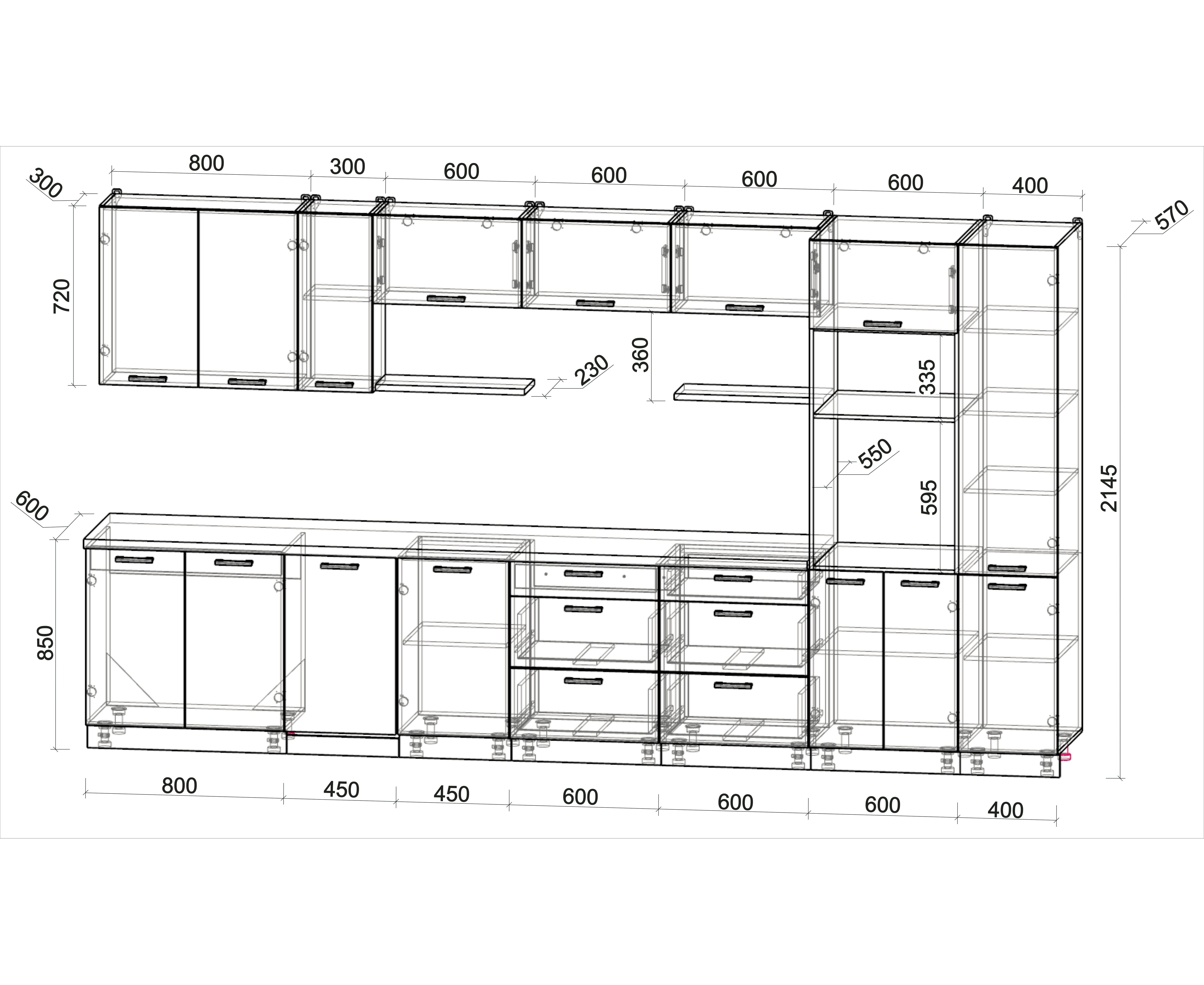 • Длина кухни 2300 мм 2400 мм 2500 мм 2600 мм 2700 мм 2800 мм 2900 мм 3000 мм 3100 мм 3200 мм 3300 мм 3400 мм 3500 мм 3600 мм 3700 мм 3800 мм 3900 мм 4000 мм