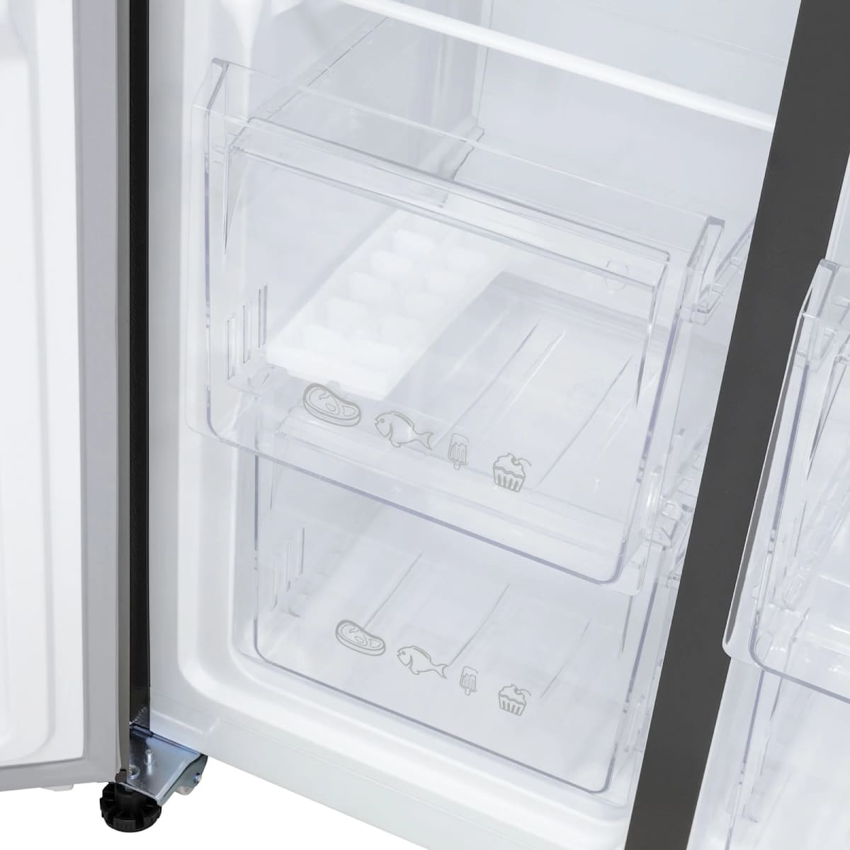 Данная модель — отдельностоящая, поэтому нужно тщательно подобрать место для ее размещения. Холодильник Side-by-Side с необычным расположением камер — сбоку друг от друга — позволяет увеличить объем продуктов для хранения. Такой вариант подходит обладателям просторной кухни, большим семьям, людям, которые запасают продукты и готовят впрок. Количество камер: 2.