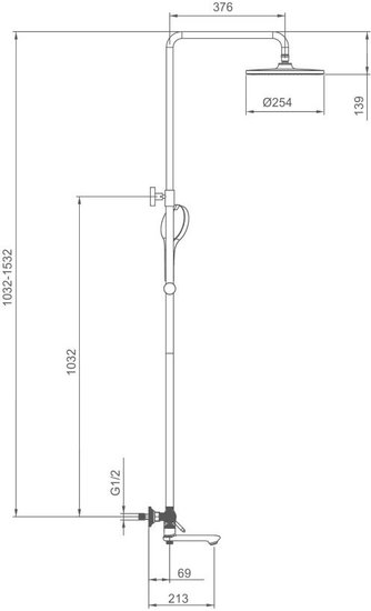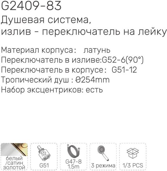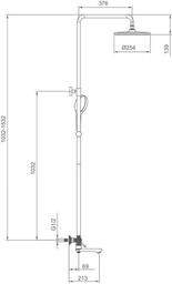 - Комплектация верхний душ, штанга, ручной душ (лейка), держатель лейки, шланг, смеситель, излив для ванны