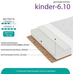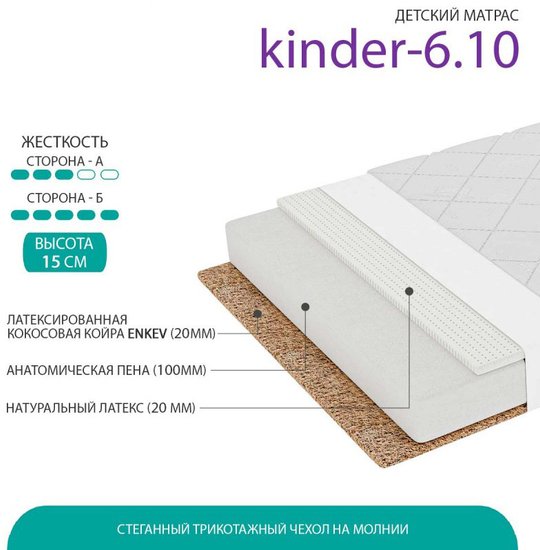 • ✅ Матрас Kinder-6.10 создан с использованием высококачественных материалов, что обеспечивает его долговечность и отличную воздухопроницаемость — важные характеристики для детского матраса.✅ Уникальная конструкция с двумя сторонами жесткости позволяет использовать его с самого рождения, обеспечивая комфорт и поддержку для вашего малыша.✅ Матрас не боится точечных нагрузок, что делает его идеальным выбором для активных детей. Внутренний технический чехол обеспечивает легкость в снятии и одевании основного чехла.✅ Благодаря молнии, чехол можно легко стирать в домашних условиях, что упрощает уход за матрасом. Он склеен термоплавким клеем от компании BeardowAdams (Великобритания), который используется в пищевой промышленности, что гарантирует отсутствие резкого запаха и безопасность для здоровья.✅ Матрас подходит для невысоких кроваток, что делает его универсальным решением для детской комнаты. Состав включает фирменный трикотажный чехол Barash на молнии, внутренний технический чехол, анатомическую пену, натуральный латекс и латексированную кокосовую койру.⚠️ Перед использованием матраса обязательно ознакомьтесь с памяткой производителя для обеспечения безопасной эксплуатации. ✅ Матрас Kinder-6.10 создан с использованием высококачественных материалов, что обеспечивает его долговечность и отличную воздухопроницаемость — важные характеристики для детского матраса.✅ Уникальная конструкция с двумя сторонами жесткости позволяет использовать его с самого рождения, обеспечивая комфорт и поддержку для вашего малыша.✅ Матрас не боится точечных нагрузок, что делает его идеальным выбором для активных детей. Внутренний технический чехол обеспечивает легкость в снятии и одевании основного чехла.✅ Благодаря молнии, чехол можно легко стирать в домашних условиях, что упрощает уход за матрасом. Он склеен термоплавким клеем от компании BeardowAdams (Великобритания), который используется в пищевой промышленности, что гарантирует отсутствие резкого запаха и безопасность для здоровья.✅ Матрас подходит для невысоких кроваток, что делает его универсальным решением для детской комнаты. Состав включает фирменный трикотажный чехол Barash на молнии, внутренний технический чехол, анатомическую пену, натуральный латекс и латексированную кокосовую койру.⚠️ Перед использованием матраса обязательно ознакомьтесь с памяткой производителя для обеспечения безопасной эксплуатации.