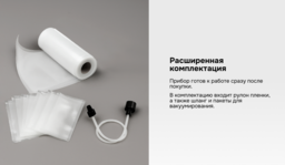 • Вид упаковочного материала в комплекте рулоны для вакуумизации, вакуумные пакеты, вакуумный шланг