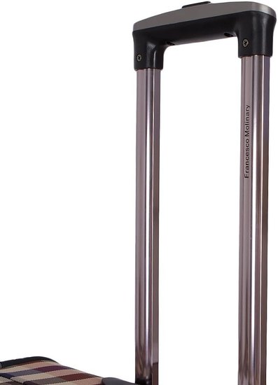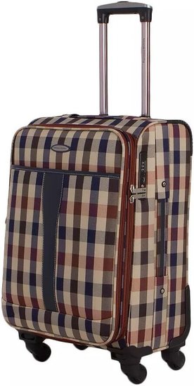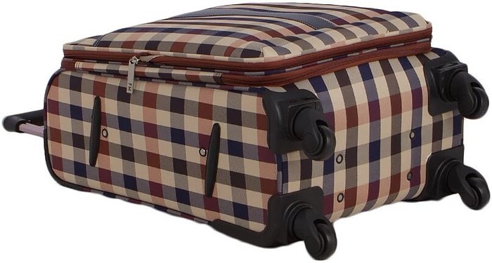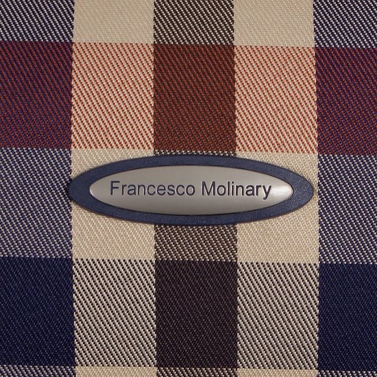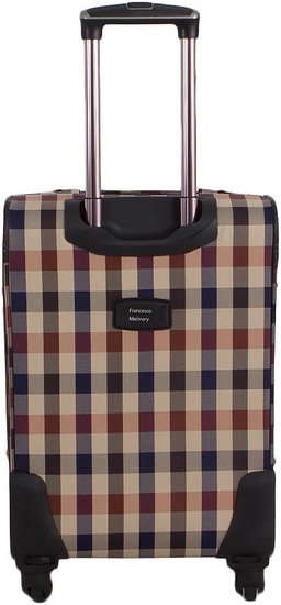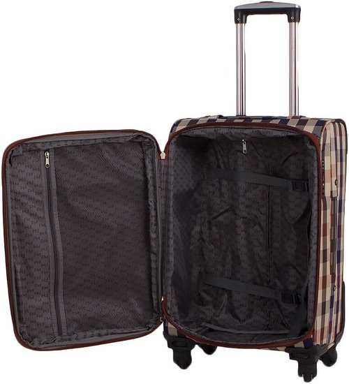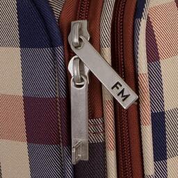 Чемодан-спиннер от бренда Francesco Molinary выполнен из плотного текстильного материала бежевого цвета в коричнево-синюю клетку. Декорирован вставками из искусственной кожи с контрастной отстрочкой. Модель на четырех съемных пластиковых колесах, с выдвижной металлической ручкой, ручками сверху и сбоку, пластиковыми ножками-опорами сбоку. Закрывается двойной антивандальной молнией, имеется кодовый замок TSA. Внутри: фирменная подкладка, на крышке – карман-сетка на молнии, в глубоком отделении – фиксирующие ремни для багажа. Имеется раздвижка на молнии для увеличения объема. На лицевой стороне – карман на молнии, на задней – адресная бирка.Чемодан-спиннер от бренда Francesco Molinary выполнен из плотного текстильного материала бежевого цвета в коричнево-синюю клетку. Декорирован вставками из искусственной кожи с контрастной отстрочкой. Модель на четырех съемных пластиковых колесах, с выдвижной металлической ручкой, ручками сверху и сбоку, пластиковыми ножками-опорами сбоку. Закрывается двойной антивандальной молнией, имеется кодовый замок TSA. Внутри: фирменная подкладка, на крышке – карман-сетка на молнии, в глубоком отделении – фиксирующие ремни для багажа. Имеется раздвижка на молнии для увеличения объема. На лицевой стороне – карман на молнии, на задней – адресная бирка.
