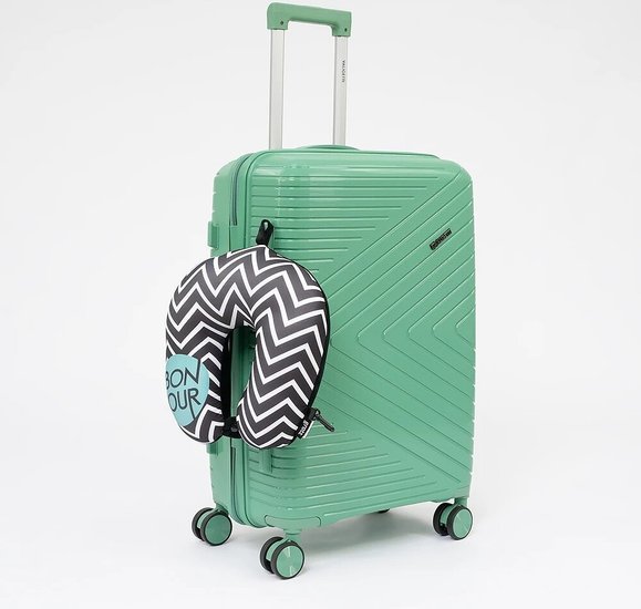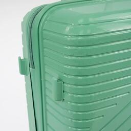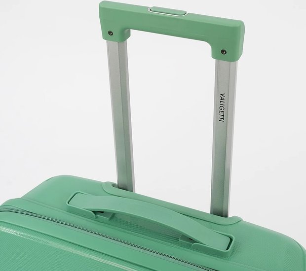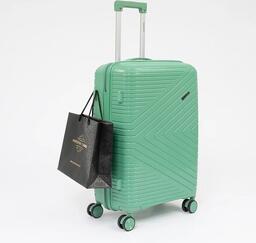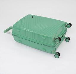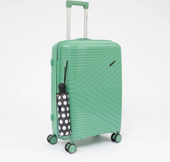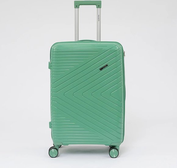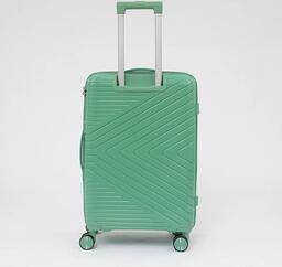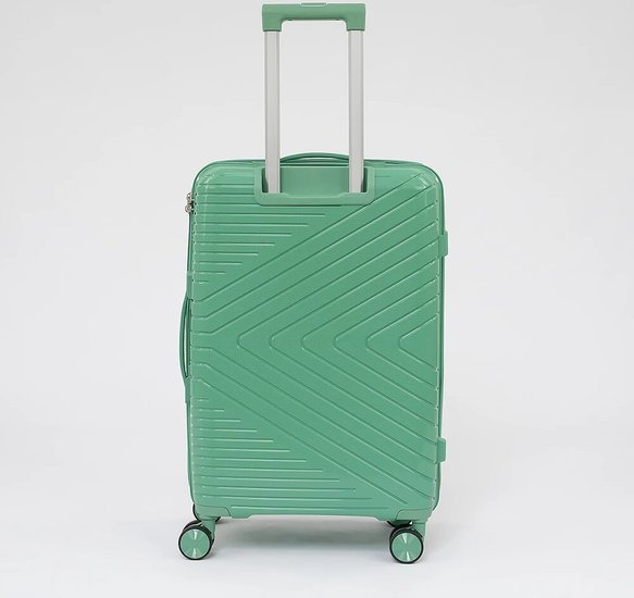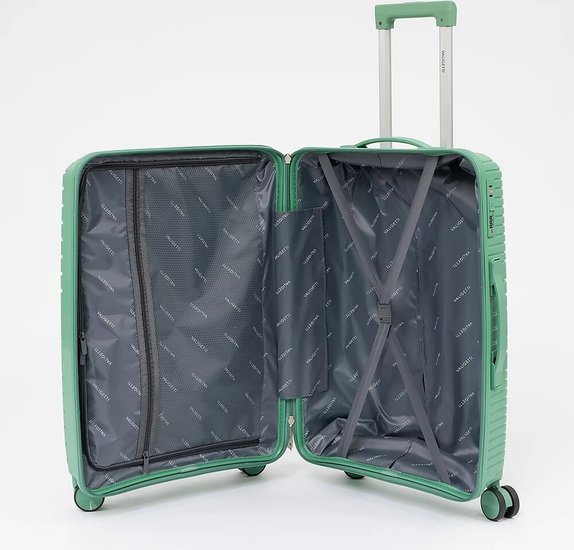 Чемодан-спиннер от торговой марки Valigetti из ударопрочного полипропилена с рельефной антивандальной поверхностью в зеленом цвете. Модель на четырех сдвоенных колесах, с выдвижной ручкой с кнопкой и железными трубками, ручкой-переноской сверху и сбоку, ножками для защиты от износа. Закрывается молнией №8 антивор, имеется кодовый замок, утопленный в корпус. Внутри: фирменная подкладка, в одной части - клапан-разделитель на молнии, карман-сетка на молнии, в другой части - перекрестные ремни для фиксации багажа. Верхние ножки выполнены в виде крючков для подвешивания.Чемодан-спиннер от торговой марки Valigetti из ударопрочного полипропилена с рельефной антивандальной поверхностью в зеленом цвете. Модель на четырех сдвоенных колесах, с выдвижной ручкой с кнопкой и железными трубками, ручкой-переноской сверху и сбоку, ножками для защиты от износа. Закрывается молнией №8 антивор, имеется кодовый замок, утопленный в корпус. Внутри: фирменная подкладка, в одной части - клапан-разделитель на молнии, карман-сетка на молнии, в другой части - перекрестные ремни для фиксации багажа. Верхние ножки выполнены в виде крючков для подвешивания.