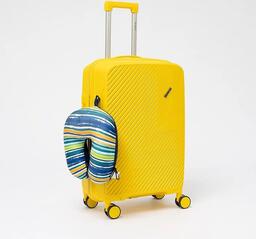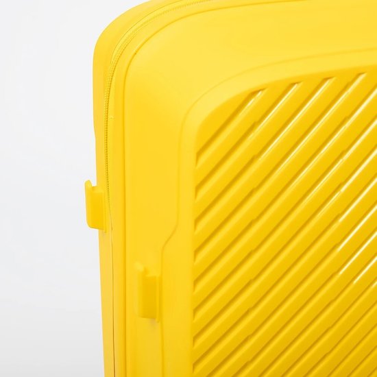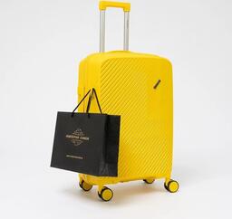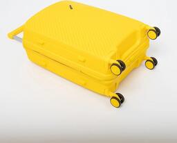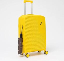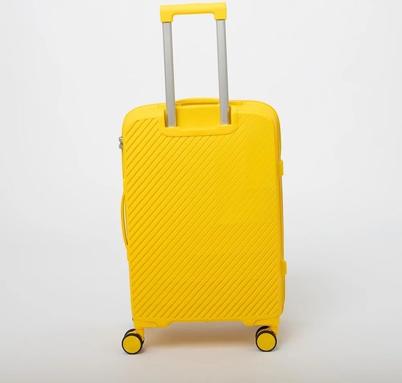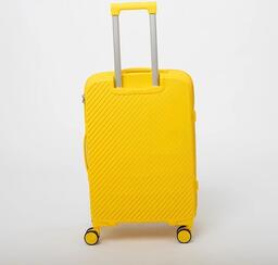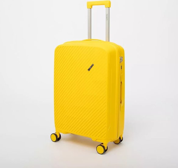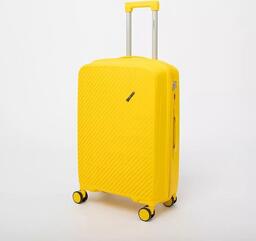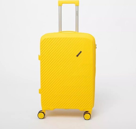 Чемодан-спиннер от торговой марки Valigetti из полипропилена желтого цвета с узорной рельефной поверхностью. Модель на четырех сдвоенных пластиковых колесах, с выдвижной ручкой, ручкой-переноской сверху и сбоку. Закрывается молнией, имеется кодовый замок, утопленный в корпус. Внутри: фирменная подкладка, в одной части - клапан-разделитель на молнии, карман-сетка, в другой части - перекрестные фиксирующие ремни для багажа. На боковых ножках предусмотрены крючки для подвешивания пакетов.Чемодан-спиннер от торговой марки Valigetti из полипропилена желтого цвета с узорной рельефной поверхностью. Модель на четырех сдвоенных пластиковых колесах, с выдвижной ручкой, ручкой-переноской сверху и сбоку. Закрывается молнией, имеется кодовый замок, утопленный в корпус. Внутри: фирменная подкладка, в одной части - клапан-разделитель на молнии, карман-сетка, в другой части - перекрестные фиксирующие ремни для багажа. На боковых ножках предусмотрены крючки для подвешивания пакетов.