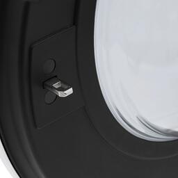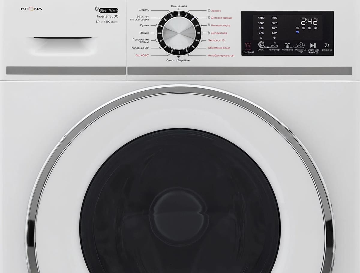 Эта модель — комбинация стирки и сушки, что полезно людям, которые не могут или не хотят приобретать отдельно сушильную машину, при этом в квартире нет балкона или лоджии, чтобы с комфортом сушить одежду на веревках. Вы можете отложить запуск, если хотите сэкономить на тарифах и включить машинку ночью, либо если планируете развесить белье сразу после возвращения работы и не ждать, пока закончится цикл. На панели управления отображаются разнообразные индикаторы, чтобы было проще следить за процессом, например: времени до окончания стирки, блокировки дверцы, выбранной программы, старт/пауза, отсрочки старта. Скорость отжима достигает 1200 оборотов в минуту. Функцию отжима можно будет отключить вручную, если она вам не нужна.