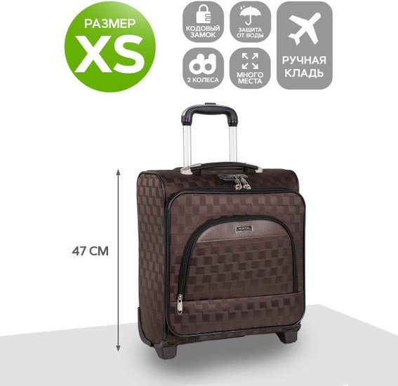 Текстильный чемодан на надежных колесах с подшипниками и прочной выдвижной тележкой подойдет в ручную кладь в большинство Авиакомпаний ( допустимые размеры уточняйте у авиаперевозчика). Наши чемоданы отлично подходят для перевозки хрупких вещей. Чемодан имеет ударопрочный корпус, выполнен из полиэстера на основе пены EVA и защищает внутреннее содержимое от любых внешних воздействий. Телескопическая ручка выдвигается на 56 см. Внутренняя тележка. Отлично организовано внутреннее пространство чемодана. Чемодан имеет одно большое отделение с фиксаторами для Ваших вещей и отделение для ноутбука, также предусмотрен кодовый замок.Текстильный чемодан на надежных колесах с подшипниками и прочной выдвижной тележкой подойдет в ручную кладь в большинство Авиакомпаний ( допустимые размеры уточняйте у авиаперевозчика). Наши чемоданы отлично подходят для перевозки хрупких вещей. Чемодан имеет ударопрочный корпус, выполнен из полиэстера на основе пены EVA и защищает внутреннее содержимое от любых внешних воздействий. Телескопическая ручка выдвигается на 56 см. Внутренняя тележка. Отлично организовано внутреннее пространство чемодана. Чемодан имеет одно большое отделение с фиксаторами для Ваших вещей и отделение для ноутбука, также предусмотрен кодовый замок.