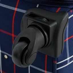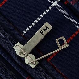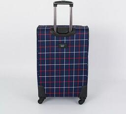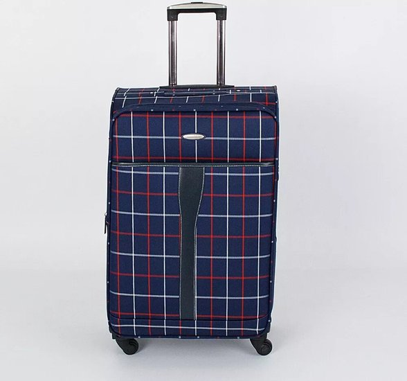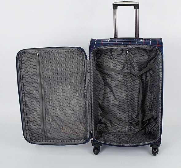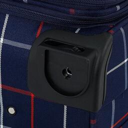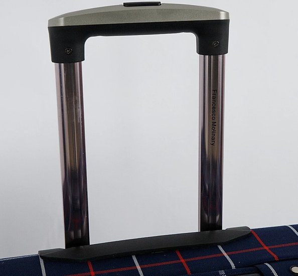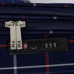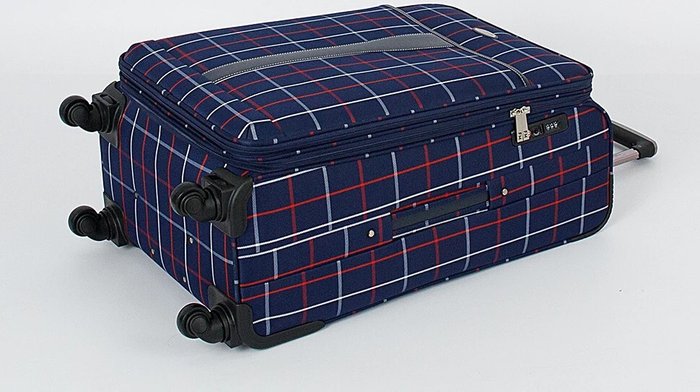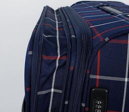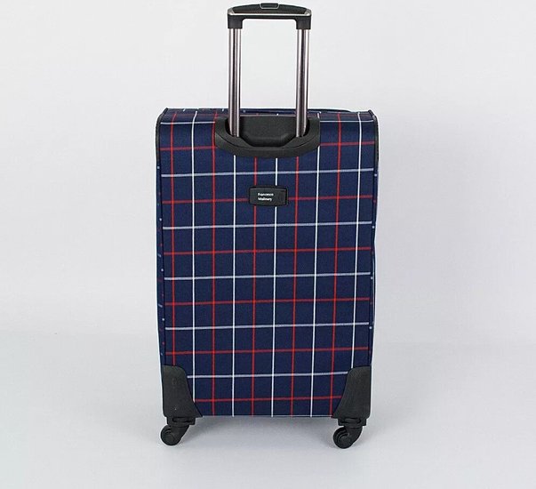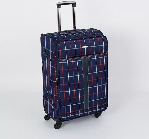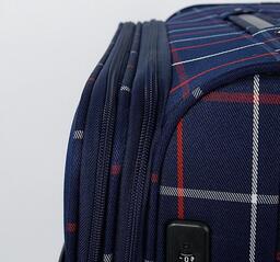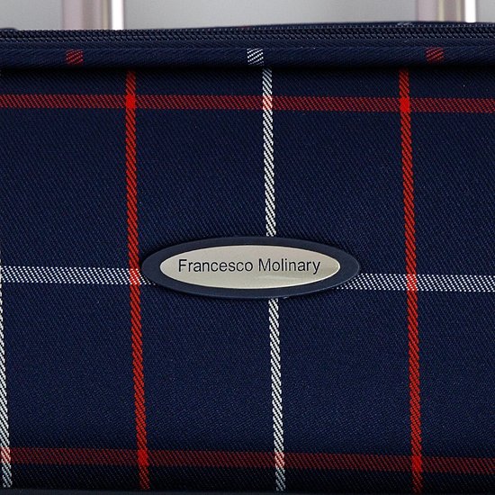 Маневренный чемодан-спиннер от торговой марки Francesco Molinary выполнен из плотного текстильного материала синего цвета в красно-белую клетку. Декорирован вставками из искусственной кожи с контрастной отстрочкой. Модель на четырех съемных пластиковых колесах, с выдвижной металлической ручкой, ручками сверху и сбоку, пластиковыми ножками-опорами сбоку. Закрывается двойной антивандальной молнией, имеется кодовый замок TSA. Внутри: фирменная подкладка, на крышке – карман-сетка на молнии, в глубоком отделении – фиксирующие ремни для багажа. Имеется раздвижка на молнии для увеличения объема. На лицевой стороне – карман на молнии, на задней – адресная бирка.Маневренный чемодан-спиннер от торговой марки Francesco Molinary выполнен из плотного текстильного материала синего цвета в красно-белую клетку. Декорирован вставками из искусственной кожи с контрастной отстрочкой. Модель на четырех съемных пластиковых колесах, с выдвижной металлической ручкой, ручками сверху и сбоку, пластиковыми ножками-опорами сбоку. Закрывается двойной антивандальной молнией, имеется кодовый замок TSA. Внутри: фирменная подкладка, на крышке – карман-сетка на молнии, в глубоком отделении – фиксирующие ремни для багажа. Имеется раздвижка на молнии для увеличения объема. На лицевой стороне – карман на молнии, на задней – адресная бирка.