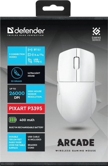 - ✅Ключевые характеристикиИгровая мышь с ультралегким весом 53 г сочетает в себе высокое разрешение сенсора до 26000 dpi, скорость отслеживания 650 дюймов/сек и максимальное ускорение 50G. Поддерживаются три режима подключения:проводное через USB Type-C, беспроводное радио 2.4 ГГц и Bluetooth 5.1, что делает устройство универсальным для геймеров любого уровня.✅Преимущества и отличияВысокоточный сенсор Pixart PAW3395 и частота опроса 1000 Гц обеспечивают мгновенный отклик и точность управления. Эргономичная форма и программируемые кнопки делают мышь удобной для длительных игровых сессий и индивидуальной настройки под пользователя.✅ПрактичностьМодель совместима с Windows, Mac OS и Linux, а встроенный аккумулятор на 400 мА·ч позволяет работать до 120 часов без подзарядки. Прочные тефлоновые ножки обеспечивают плавное скольжение, а программное обеспечение позволяет гибко настраивать функционал.✅УникальностьОсобенностью устройства является сочетание минимального веса с поддержкой трех режимов подключения, встроенной памяти для макросов и возможности зарядки через USB Type-C. Программируемые кнопки расширяют сценарии использования, делая мышь подходящей не только для игр, но и для продуктивной работы. ✅Ключевые характеристикиИгровая мышь с ультралегким весом 53 г сочетает в себе высокое разрешение сенсора до 26000 dpi, скорость отслеживания 650 дюймов/сек и максимальное ускорение 50G. Поддерживаются три режима подключения:проводное через USB Type-C, беспроводное радио 2.4 ГГц и Bluetooth 5.1, что делает устройство универсальным для геймеров любого уровня.✅Преимущества и отличияВысокоточный сенсор Pixart PAW3395 и частота опроса 1000 Гц обеспечивают мгновенный отклик и точность управления. Эргономичная форма и программируемые кнопки делают мышь удобной для длительных игровых сессий и индивидуальной настройки под пользователя.✅ПрактичностьМодель совместима с Windows, Mac OS и Linux, а встроенный аккумулятор на 400 мА·ч позволяет работать до 120 часов без подзарядки. Прочные тефлоновые ножки обеспечивают плавное скольжение, а программное обеспечение позволяет гибко настраивать функционал.✅УникальностьОсобенностью устройства является сочетание минимального веса с поддержкой трех режимов подключения, встроенной памяти для макросов и возможности зарядки через USB Type-C. Программируемые кнопки расширяют сценарии использования, делая мышь подходящей не только для игр, но и для продуктивной работы.