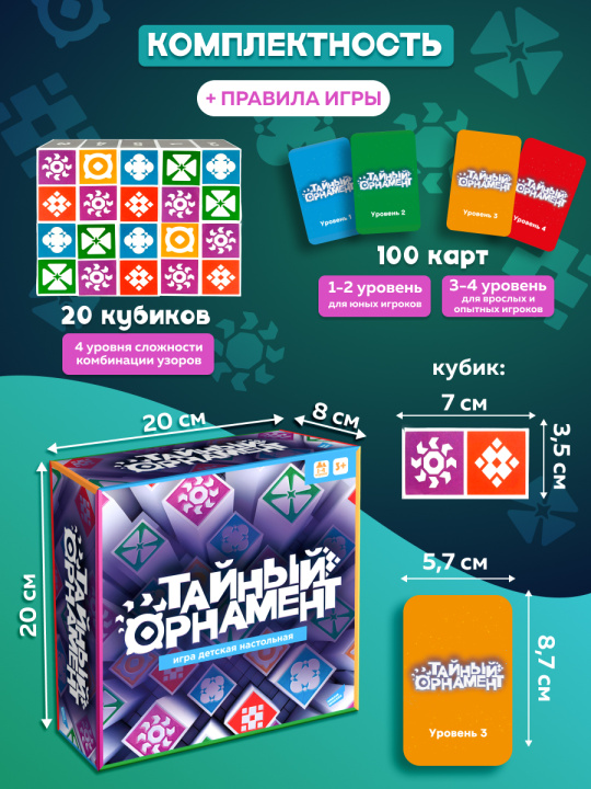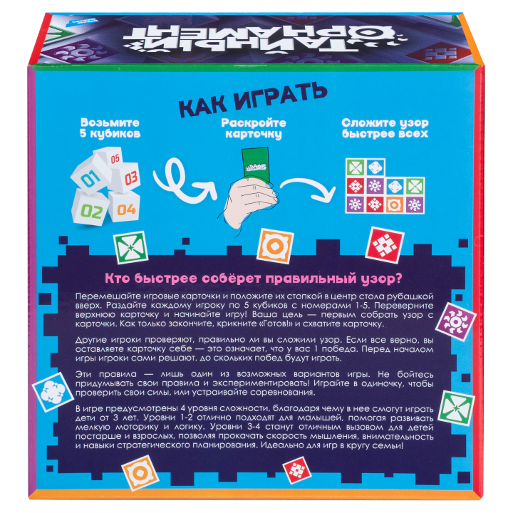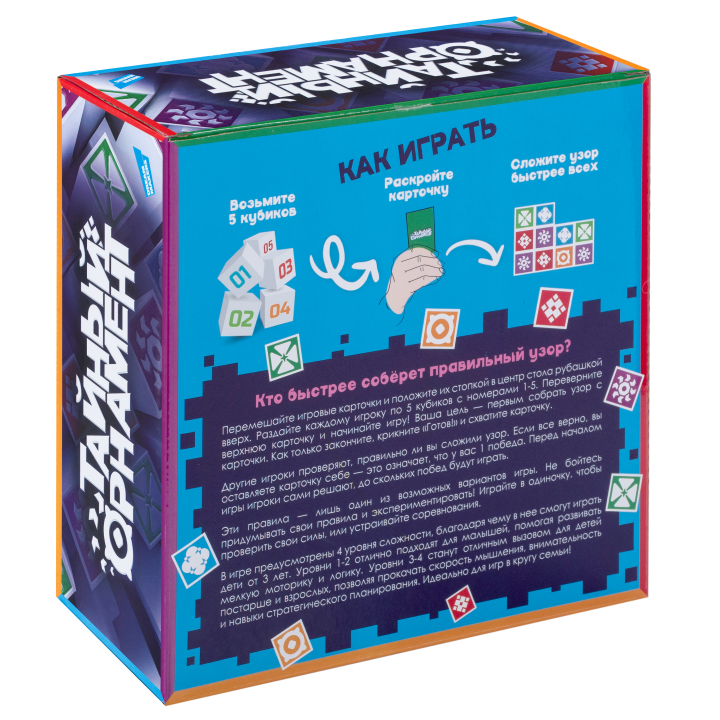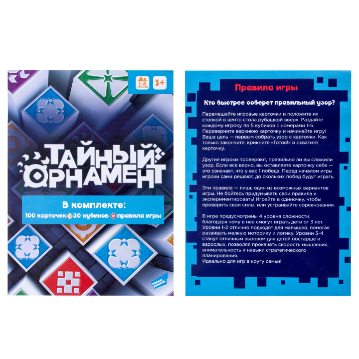 Настольная детская игра Dream Makers "Тайный орнамент" Характеристики : Количество игроков: 2+ Возраст: от 3 лет Уровни сложности: 4 Время партии: 10-15 минут Материал: пластик, картон Правила игры: Перемешайте карточки и сложите стопкой в центре стола рубашкой вверх Раздайте каждому игроку по 5 кубиков с номерами 1-5 Переверните верхнюю карточку - все игроки одновременно начинают собирать изображенный на ней узор Первый закончивший игрок кричит "Готов!" и забирает карточку Остальные игроки проверяют правильность узора: Если узор собран верно - игрок оставляет карточку себе (1 победа) Если допущены ошибки - карточка возвращается в низ колоды Игра продолжается до достижения согласованного количества побед Комплектация: 20 пронумерованных кубиков (1-5) 100 двусторонних карточек с узорами Правила игры Особенности : 4 уровня сложности (1-2 для малышей, 3-4 для взрослых) Развивает скорость реакции, логику и моторику Возможность создавать собственные правила Компактные размеры: 20×8×7 см (упаковка) Подходит для индивидуальных и групповых занятий Описание Динамичная развивающая игра на скорость и внимание для детей от 3 лет и взрослых. Игроки соревнуются в быстром воспроизведении узоров с карточек с помощью разноцветных кубиков. Идеальный вариант для семейного досуга, сочетающий азарт и развитие ключевых навыков. Характеристики Артикул: 1111-119H Ширина (см): 8 Длина (см): 20 Высота (см): 20 Возраст от: 3 Пол: Мальчикам / Девочкам Новинка: Да