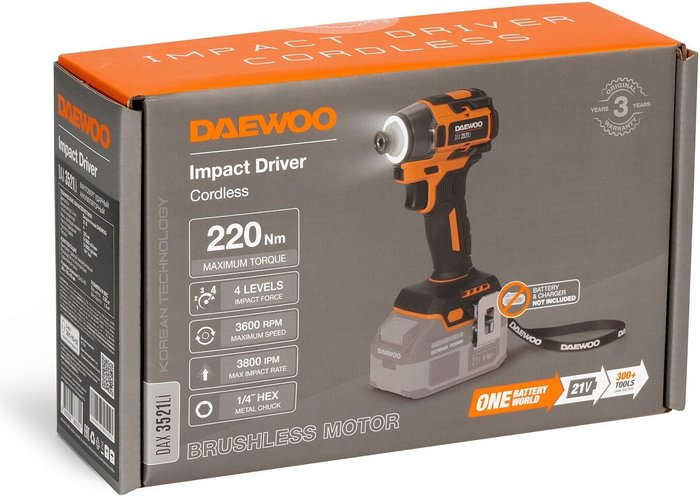 ✅Ключевые характеристикиАккумуляторный винтоверт с бесщеточным двигателем и максимальным крутящим моментом 220 Н·м предназначен для интенсивных монтажных и сборочных работ. Компактный корпус (вес 0.93 кг) и эргономичная рукоятка обеспечивают удобство длительного использования, а шестигранный патрон 1/4" позволяет быстро менять оснастку.✅Преимущества и отличияЧетыре режима регулировки крутящего момента (20, 30, 80, 220 Н·м) и четыре интеллектуальных режима работы делают инструмент универсальным для различных задач. Электронная панель управления, кольцевая LED-подсветка с тремя уровнями яркости и функция фонаря значительно повышают комфорт и безопасность эксплуатации.✅ПрактичностьМодель совместима со всеми аккумуляторами и зарядными устройствами DAEWOO на 21 В, что удобно для пользователей экосистемы бренда. Быстрозажимной патрон, реверс, индикатор уровня заряда, а также защита аккумулятора от перегрева и перезаряда повышают надежность и функциональность инструмента.✅УникальностьИнтеллектуальные режимы автоматической остановки и регулировки скорости делают работу более точной и бережной к материалам. Металлическая скоба для крепления на поясе и возможность отключения кнопки быстрого доступа подчеркивают профессиональный подход к деталям конструкции.✅Ключевые характеристикиАккумуляторный винтоверт с бесщеточным двигателем и максимальным крутящим моментом 220 Н·м предназначен для интенсивных монтажных и сборочных работ. Компактный корпус (вес 0.93 кг) и эргономичная рукоятка обеспечивают удобство длительного использования, а шестигранный патрон 1/4" позволяет быстро менять оснастку.✅Преимущества и отличияЧетыре режима регулировки крутящего момента (20, 30, 80, 220 Н·м) и четыре интеллектуальных режима работы делают инструмент универсальным для различных задач. Электронная панель управления, кольцевая LED-подсветка с тремя уровнями яркости и функция фонаря значительно повышают комфорт и безопасность эксплуатации.✅ПрактичностьМодель совместима со всеми аккумуляторами и зарядными устройствами DAEWOO на 21 В, что удобно для пользователей экосистемы бренда. Быстрозажимной патрон, реверс, индикатор уровня заряда, а также защита аккумулятора от перегрева и перезаряда повышают надежность и функциональность инструмента.✅УникальностьИнтеллектуальные режимы автоматической остановки и регулировки скорости делают работу более точной и бережной к материалам. Металлическая скоба для крепления на поясе и возможность отключения кнопки быстрого доступа подчеркивают профессиональный подход к деталям конструкции.