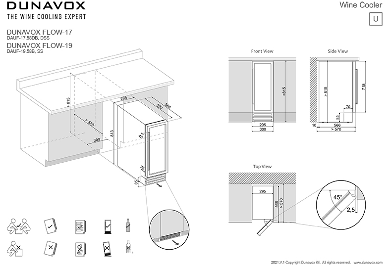 Винный холодильник Dunavox DAUF-17.58DMB имеет две температурные зоны, в которых одновременно можно хранить разные сорта алкоголя и выставлять разные сочетания настроек. Он встраивается в нишу, что удобно, если у вас ограничен метраж помещения. Благодаря компактным размерам данная модель — отличный выбор для офиса, гостиничного номера. Количество бутылок, которое можно разместить с учетом полной комплектации и из расчета объема бутылки 0,75 л, — 17 шт.