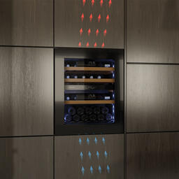 Специальное покрытие защищает вино от влияния ультрафиолетовых лучей, которые проникают, если шкаф находится в солнечной комнате. Хранение становится еще безопаснее и герметичнее благодаря нескольким слоям стекол. Цвет корпуса — черный матовый. Дверь можно перевесить на другую сторону, поэтому вариантов размещения его в доме становится больше. Доводчик делает открытие и закрытие плавным.