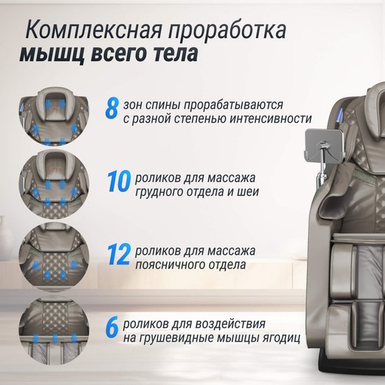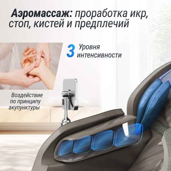 ✅ Представьте, как вы возвращаетесь домой после долгого рабочего дня. Устали? Напряжение в мышцах? Стресс? Забудьте об этом! Массажное кресло UNIX Med Amelia превратит ваш дом в настоящий спа-салон!✅ Это электрическое массажное кресло оснащено современными воздушными подушками и массажными головками, которые обеспечивают глубокий и расслабляющий массаж всего тела. Воздушные подушки мягко обнимают вас, создавая легкое давление, что помогает снять напряжение и улучшить кровообращение. Восемь массажных головок прорабатывают проблемные зоны на спине, обеспечивая целенаправленное воздействие на напряженные мышцы.✅ Режим ZERO GRAVITY с возможностью выбора положения поможет снять усталость и улучшить кровообращение, имитируя состояние невесомости. Активация ZERO-G наклоняет кресло под углом 40 градусов, равномерно распределяя нагрузку по телу. Это создает ощущение легкости и максимального расслабления, что значительно увеличивает пользу от массажа. Такой режим идеально подходит для людей с высокими физическими нагрузками.✅ Аэромассаж с воздушно-компрессионными подушками по всему креслу воздействует на все тело. Он нормализует кровообращение, убирает отечность и благотворно влияет на лимфатическую и сердечно-сосудистую системы. Чередование компрессии и обычного массажа способствует восстановлению упругости кожи и ее эластичности.✅ Управление креслом стало проще! Интуитивно понятный сенсорный пульт на подлокотнике позволяет легко настраивать массаж. Вы можете регулировать подогрев, скорость и время, а широкий диапазон давления поможет адаптировать массаж под ваши потребности.✅ Выбор программ и режимов массажа разнообразен. Вы можете выбрать автоматические режимы, такие как разминание, Шиацу, силовой режим и другие. Также доступен аэромассаж и возможность настроить интенсивность воздействия на определенные зоны. Функция подогрева спины добавляет комфорта во время сеанса.✅ Ролики кресла имеют функцию ИК-прогрева, что делает массаж еще более эффективным. Это улучшает циркуляцию крови и обменные процессы, а также оказывает болеутоляющее действие. Кресло потребляет всего 60 Вт.✅ Встроенные динамики позволят вам наслаждаться любимой музыкой через Bluetooth с качественным звуком Hi-Fi во время массажа. Синхронизируйте свою музыку с массажным механизмом и расслабьтесь под звуки, которые вам нравятся. Массажное кресло не только функционально, но и стильно, благодаря элегантному дизайну и качественным материалам оно идеально впишется в любой интерьер. TFT экран с удобными настройками позволяет легко переключаться между режимами массажа, не вставая с кресла.✅ Представьте, как вы возвращаетесь домой после долгого рабочего дня. Устали? Напряжение в мышцах? Стресс? Забудьте об этом! Массажное кресло UNIX Med Amelia превратит ваш дом в настоящий спа-салон!✅ Это электрическое массажное кресло оснащено современными воздушными подушками и массажными головками, которые обеспечивают глубокий и расслабляющий массаж всего тела. Воздушные подушки мягко обнимают вас, создавая легкое давление, что помогает снять напряжение и улучшить кровообращение. Восемь массажных головок прорабатывают проблемные зоны на спине, обеспечивая целенаправленное воздействие на напряженные мышцы.✅ Режим ZERO GRAVITY с возможностью выбора положения поможет снять устало