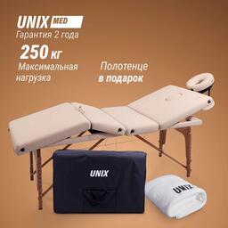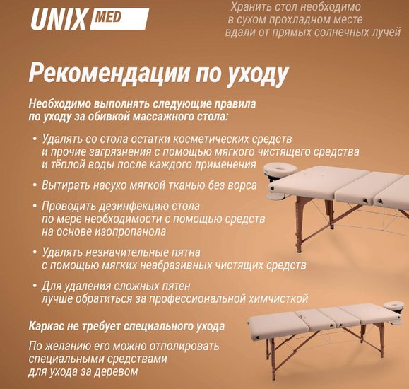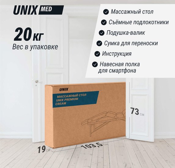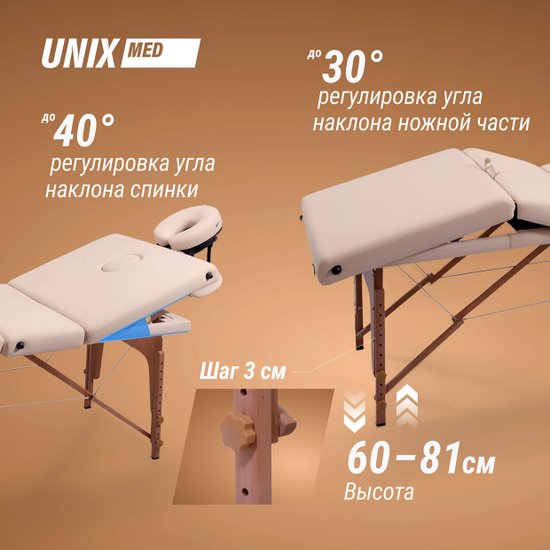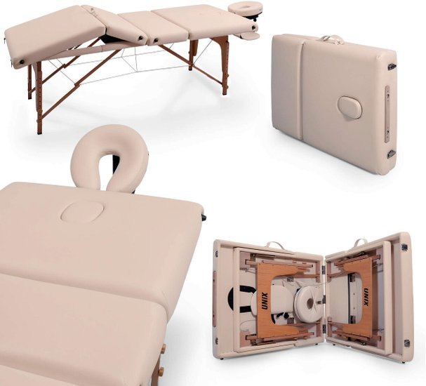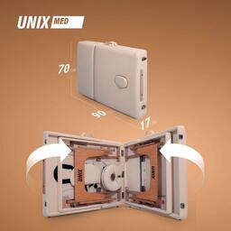 Складной четырехсекционный массажный стол UNIX Premium Cream является универсальным решением для всех типов массажных кабинетов, салонов красоты,тату-салонов, домашних студий и даже мобильных мастеров, которым важна компактность, легкость и практичность оборудования. Этот стол для массажа сочетает в себе элегантный дизайн и удивительную легкость сборки. Благодаря складной конструкции, он превращается в удобный чемоданчик размером 90 х 70 х 17 см, который легко транспортировать. Прочная сумка делает перемещение стола простым и безопасным, а его компактные размеры позволяют хранить его практически в любом помещении. Сумка защитит стол и аксессуары от царапин и повреждений во время транспортировки.Деревянная кушетка для массажа выделяется невероятно прочной конструкцией, способной выдержать общую нагрузку до 250 кг (не перегружайте стол сверх рекомендованного предела веса). Благодаря своим компактным размерам он идеально впишется даже в самые небольшие помещения, будь то СПА-салон, домашний кабинет или офис. Возможность ручной регулировки высоты ножек от 60 до 81 см с шагом 3 см позволяет адаптировать стол под рост массажиста, обеспечивая наилучшую результативность сеансов массажа. Ложе толщиной 7 см обеспечит дополнительную поддержку и комфорт. Для еще большего удобства массажного стола в комплекте предусмотрены регулируемый по наклону и высоте подголовник и подставка для гаджетов, расположенная у изголовья, а также боковые подлокотники.Одним из ключевых преимуществ стола является возможность точной настройки положения каждого элемента. Возможность изменения угла наклона и высоты подголовника позволяет обеспечить комфортное положение головы и шеи клиента. Спинка настраивается для поддержки клиента в разных положениях, включая сидячее и лежачее. Секция в изголовье регулируется от 0 до 40 градусов, а ножная часть может подниматься на 30 градусов, улучшая доступ к клиенту и помогая мастеру эффективно массировать тело, руки, ноги и стопы. Эти функции делают стол удобным как для мастера, так и для клиента, позволяя создавать индивидуальные условия для каждого сеанса. Складная кушетка обшита высококачественной экокожей, которая обладает влагонепроницаемыми свойствами. Такая обивка идеально подходит для использования масел и кремов, ведь она не впитывает жидкости и легко очищается. Эластичный наполнитель поролон обеспечивает мягкую поддержку телу, создавая ощущение комфорта и расслабления. Регулируемый валик и подголовник помогают правильно распределять давление на шею и голову, предотвращая дискомфорт и усталость. Подголовник поддерживает голову в нужном положении, минимизируя напряжение мышц шеи. Эти особенности обеспечивают глубокий уровень релаксации и комфорта, повышая эффективность любой массажной или косметологической процедуры.В комплектацию входят съёмные подлокотники, полка для гаджетов, подушка-валик, полотенце и сумка для транспортировки. Складная кушетка идеально подойдет для различных видов массажа, включая расслабляющий, лечебный и антицеллюлитный. Отличный вариант для частных мастеров, желающих создать уютную атмосферу у себя дома. Подходит для проведения коротких массажей в перерывах между работой. Прекрасно справляется с задачей поддержки клиента во время длительных процедур нанесения татуи